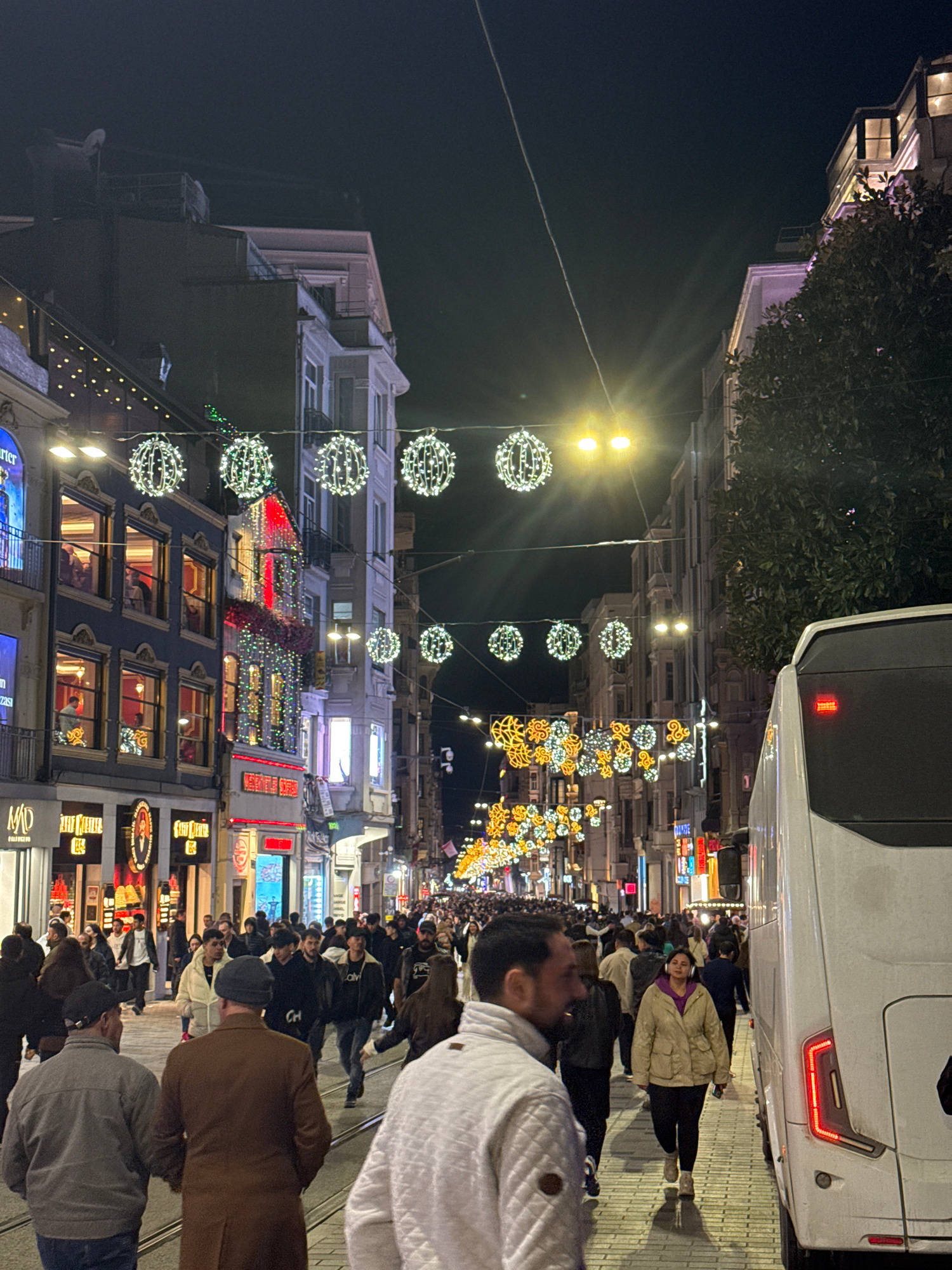 Captured at night, the image portrays the lively İstiklal Caddesi street in Beyoğlu, Turkey. A throng of people fills the pedestrian walkway, with pedestrians wearing a range of clothing styles, inclu…read more