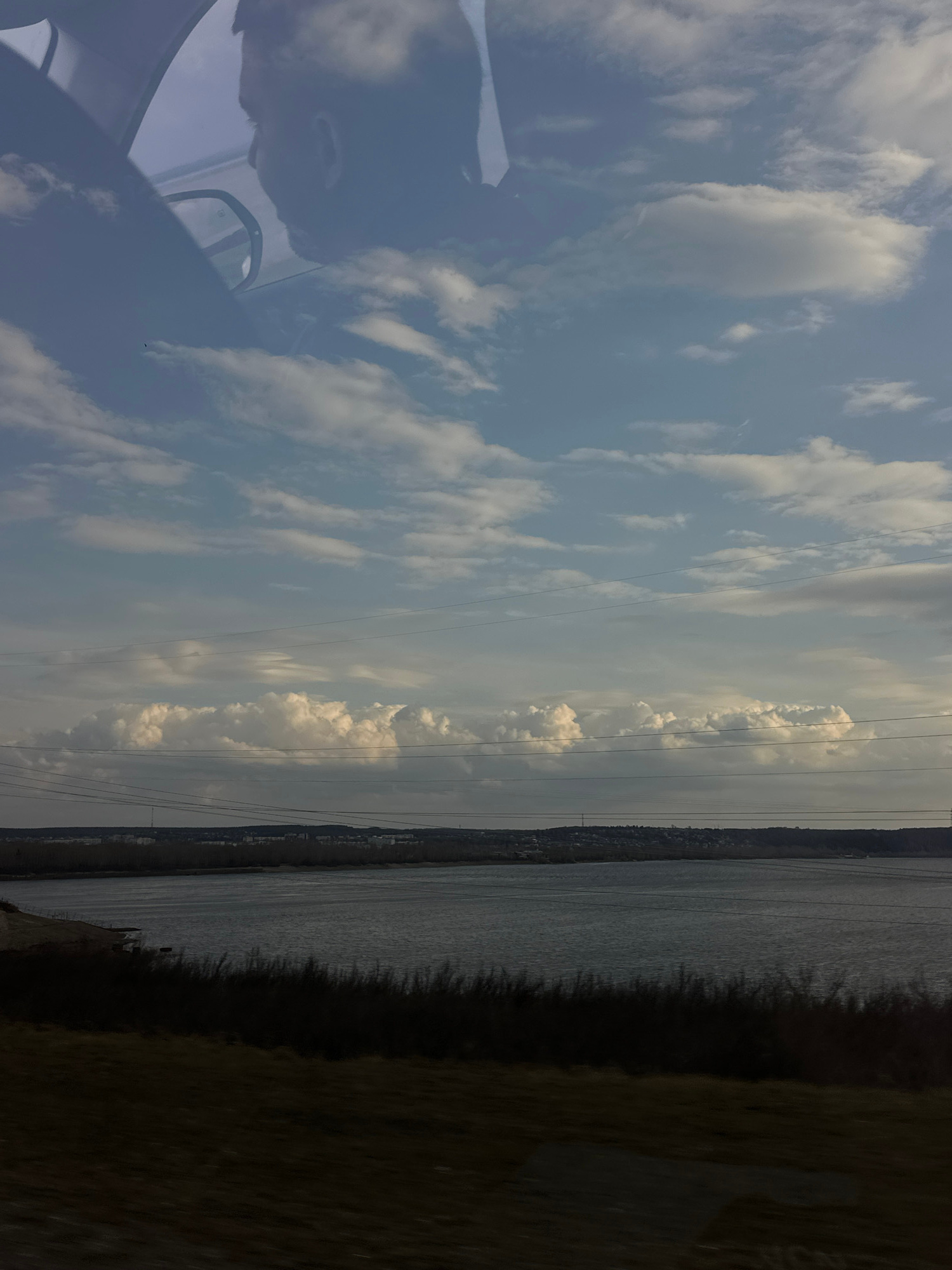 The image appears to be taken from inside a vehicle, possibly a car or aircraft, overlooking a body of water and the city of Chaikovsky, Russia. The sky is filled with clouds, ranging from thin wisps…read more
