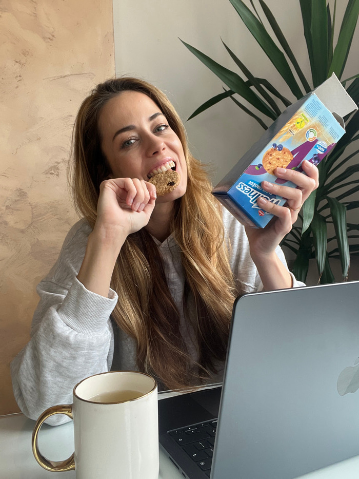 The image depicts an indoor scene in Bar, Montenegro. A woman with long, light brown hair, wearing a grey hooded sweatshirt, is seated at a white table. She is looking directly at the camera, biting i…read more