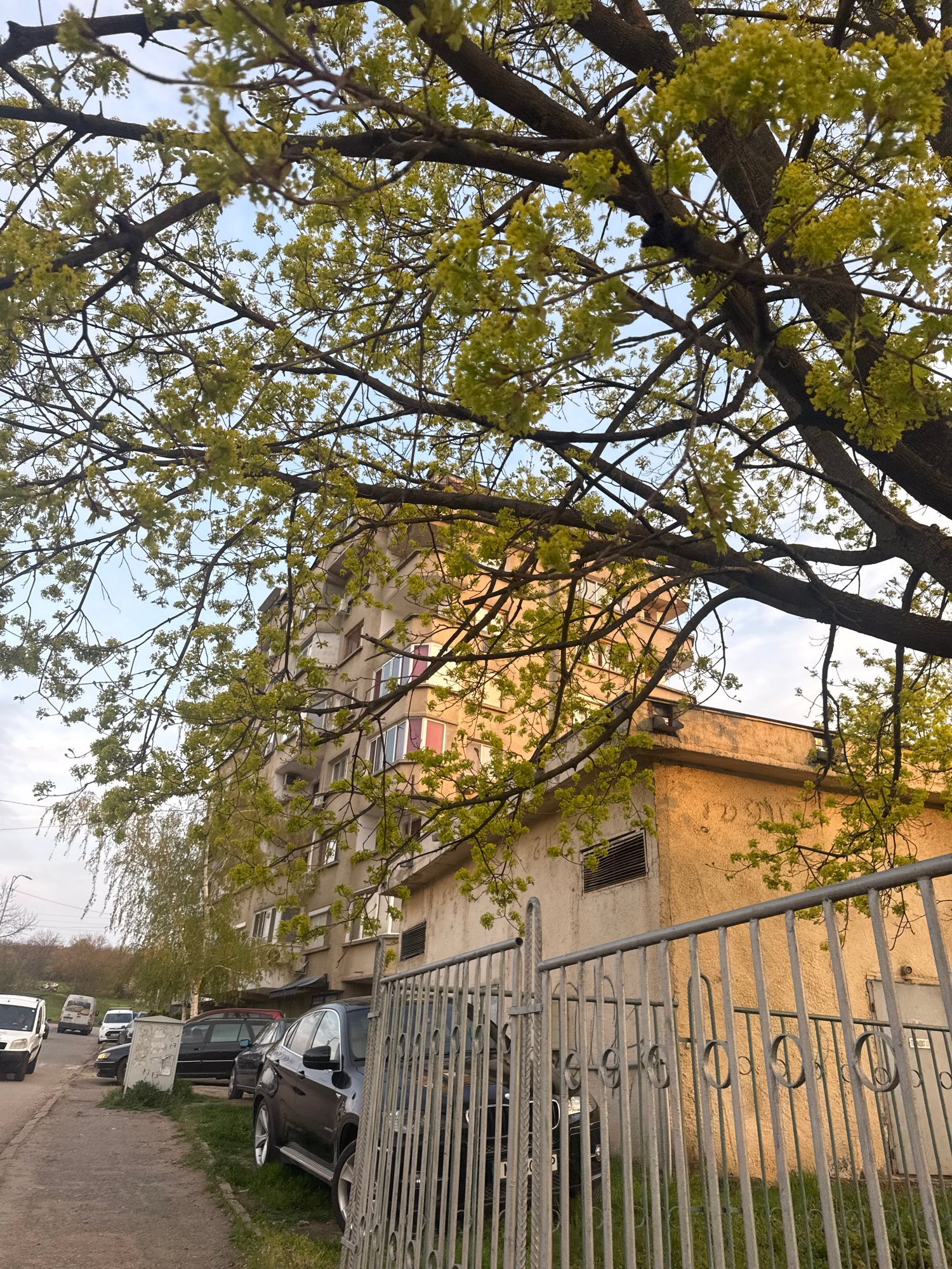 The image depicts a street scene in Montana, Bulgaria. In the foreground, a large tree with light green foliage dominates the left side of the frame. Behind the tree, a multi-story building is visibleβ¦read more