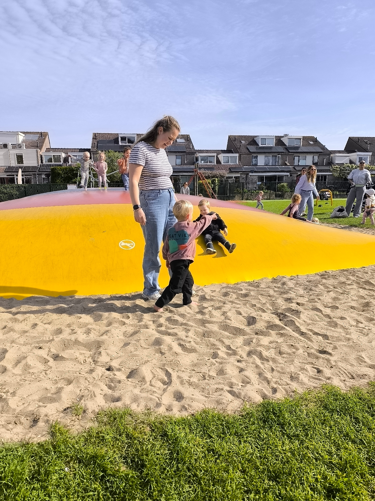 This outdoor image depicts a lively playground scene in Alkmaar, Netherlands, on a bright, sunny day. The main feature is a large, inflated bouncing pillow, primarily yellow at the base and reddish-pi…read more