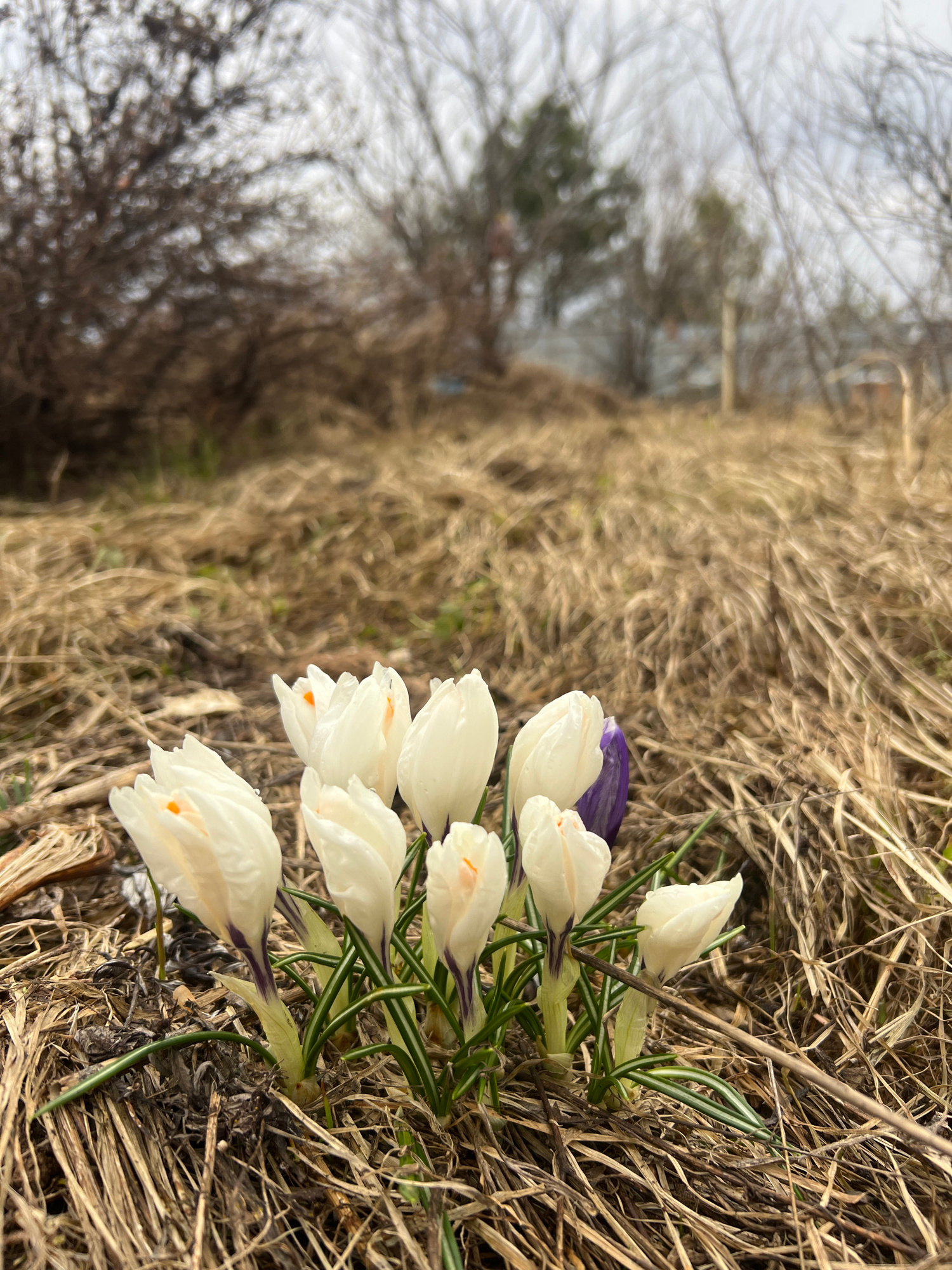 The image shows a patch of white and purple crocuses blooming amongst dry, brown grass. The scene appears to be at ground level. The background contains blurred trees and what seems like a fence. Give…read more