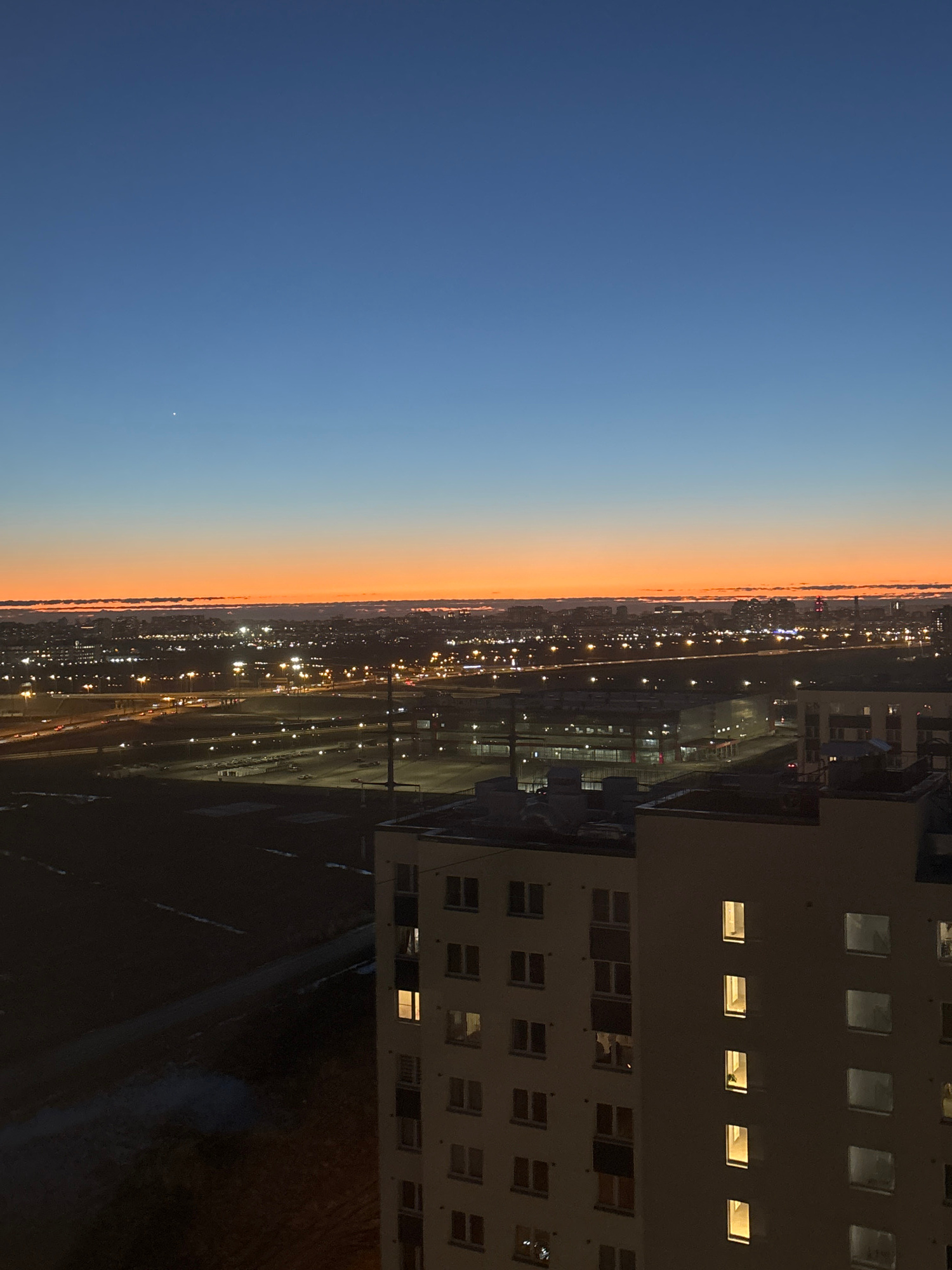 The image shows a nighttime cityscape in Murino, Russia, taken from an elevated position, possibly from a high-rise building. The scene is divided into three primary sections: the sky, the city, and t…read more