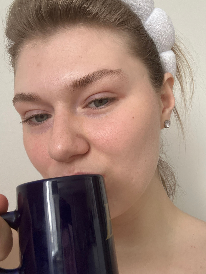 The image captures a close-up, rotated portrait of a person, likely female, appearing to drink from a dark blue mug. The person has fair skin, light brown hair, and neutral facial features with open e…read more