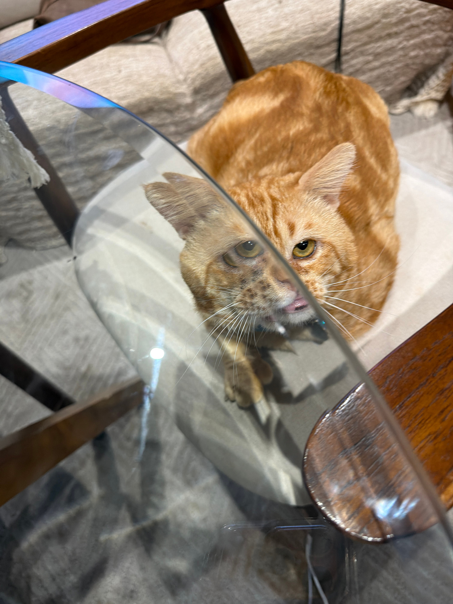 A photograph taken from above shows an orange tabby cat partially visible above a glass table, with its reflection seen on the glass surface. The cat has green eyes and white whiskers. The table has a…read more