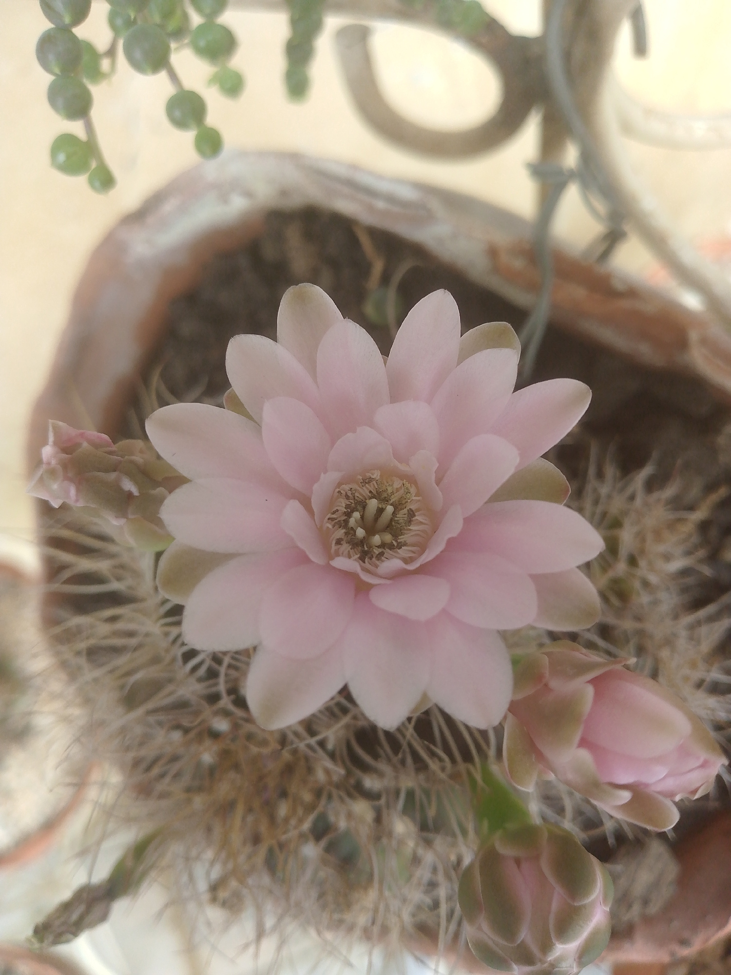 The image depicts a cactus in a terracotta pot. The cactus is in bloom, with a large, pink flower dominating the frame. Two other flower buds are also visible. The cactus has long, thin spines. There…read more