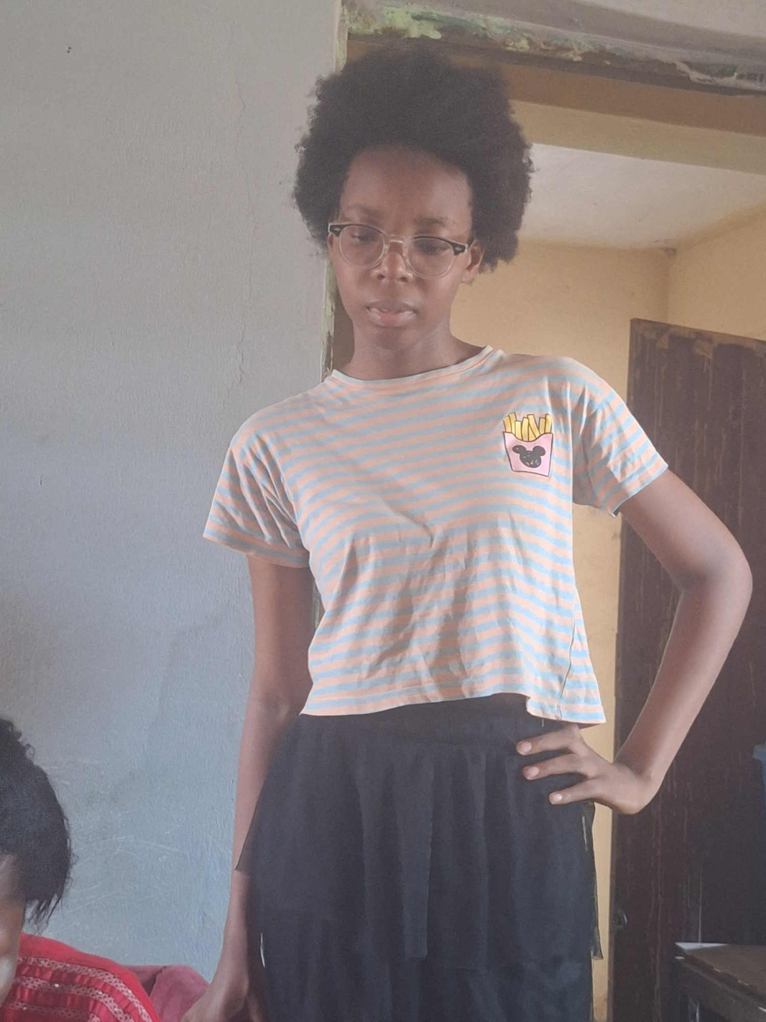 The image, oriented 90 degrees clockwise, captures a person standing and posing for the camera. The main subject is a young person with dark, short, curly hair and light-rimmed eyeglasses. They are lo…read more