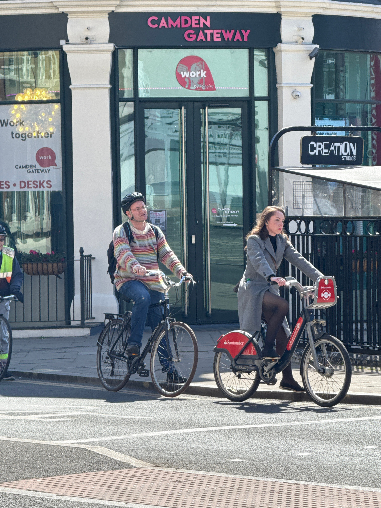 The image shows two people riding bicycles on a city street in London, United Kingdom. A woman is on a red Santander bike, wearing a gray coat, black top, and tights. A man is on a black bike and is w…read more