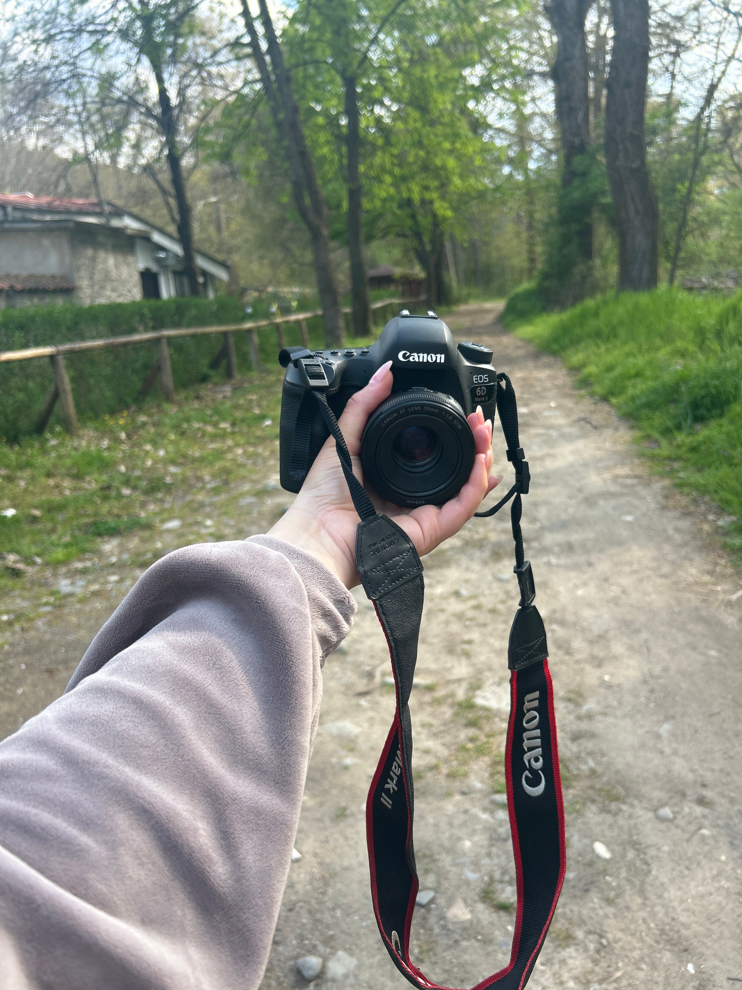 A first-person perspective image shows a person's hand holding a Canon DSLR camera outdoors on a bright day. The camera is a black Canon EOS 6D Mark II, fitted with a Canon EF 50mm 1:1.8 STM lens with…read more