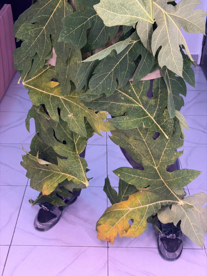 The scene in Igboefon, Nigeria, depicts a person largely obscured by a dense arrangement of numerous large, green palmate leaves, consistent with *Carica papaya* (papaya) foliage. The individual's low…read more
