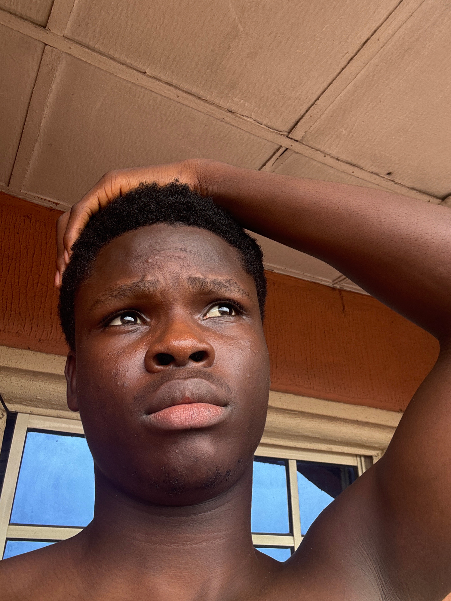 A close-up, low-angle selfie shows a dark-skinned young man. His right arm is raised and his hand is near his head. He has short, dark hair and appears to be near a building with a window showing a bl…read more