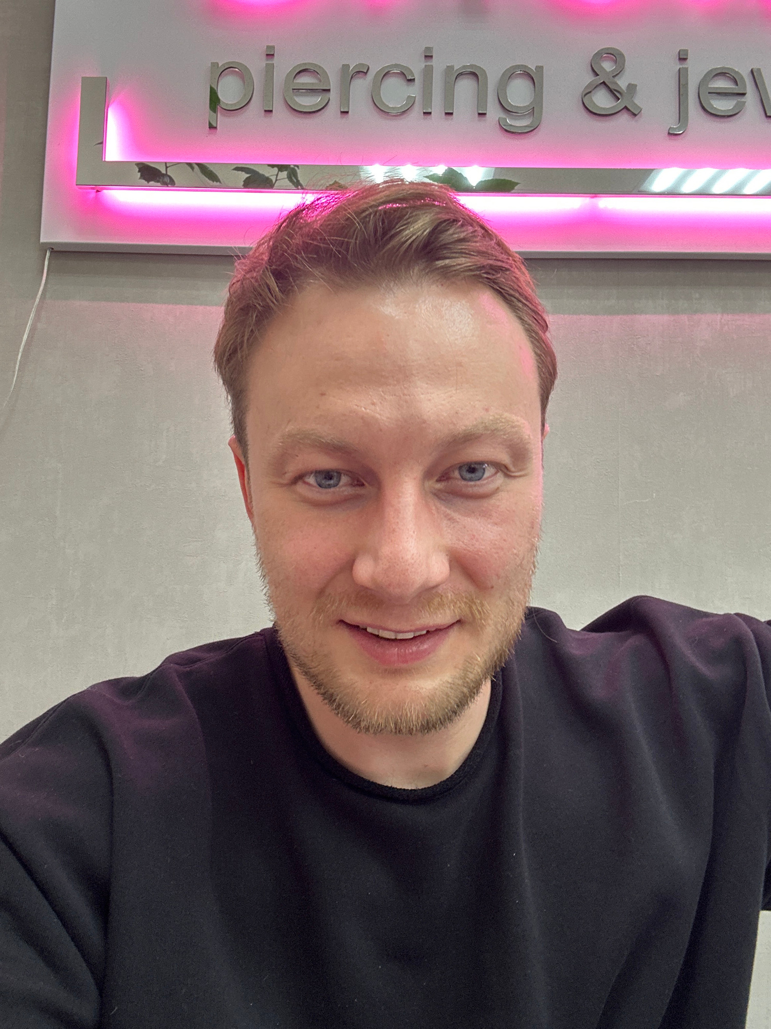 The image, originally oriented 90 degrees counter-clockwise, depicts a man taking a selfie indoors. He is a light-skinned individual with short, light brown hair and blue eyes, sporting a short beard…read more