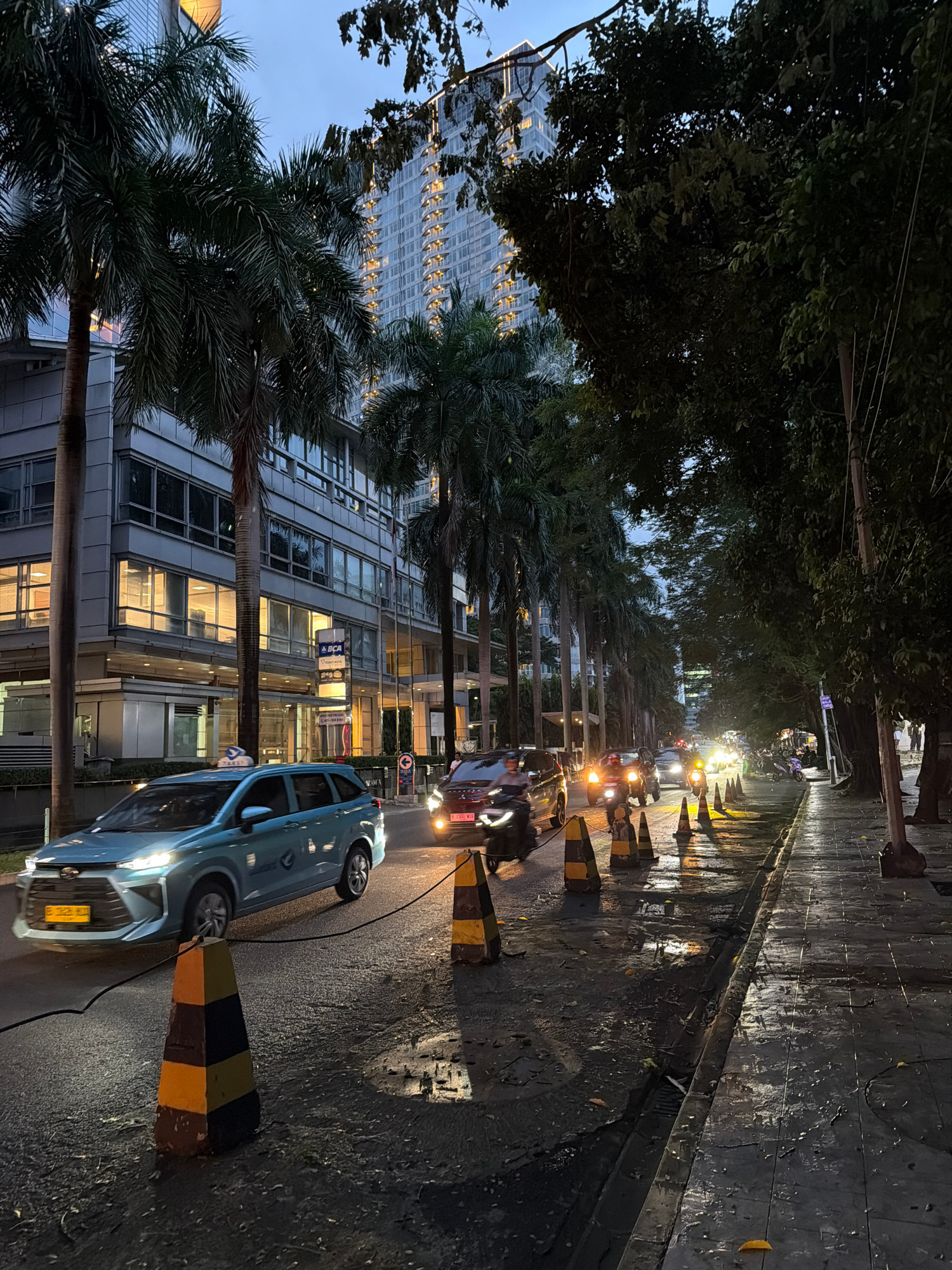 The image depicts a street in what appears to be a commercial district in South Jakarta, Indonesia. The wet road reflects streetlights and car headlights. A line of palm trees separates the street froβ¦read more