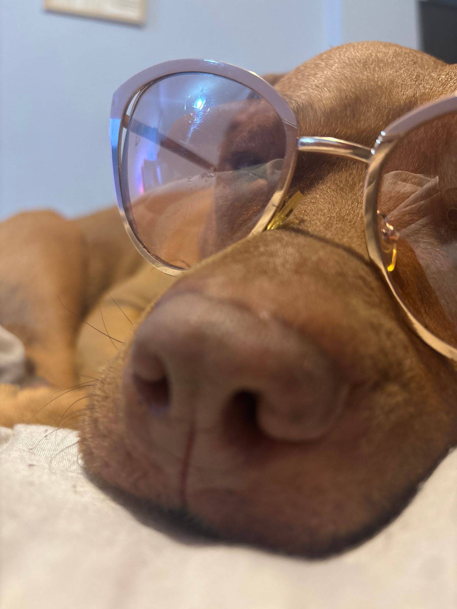 A close-up shot focuses on the snout of a brown dog, which is wearing gold-framed sunglasses. The dog's nose fills much of the left side of the frame. The sunglasses are positioned on the dog's face,…read more
