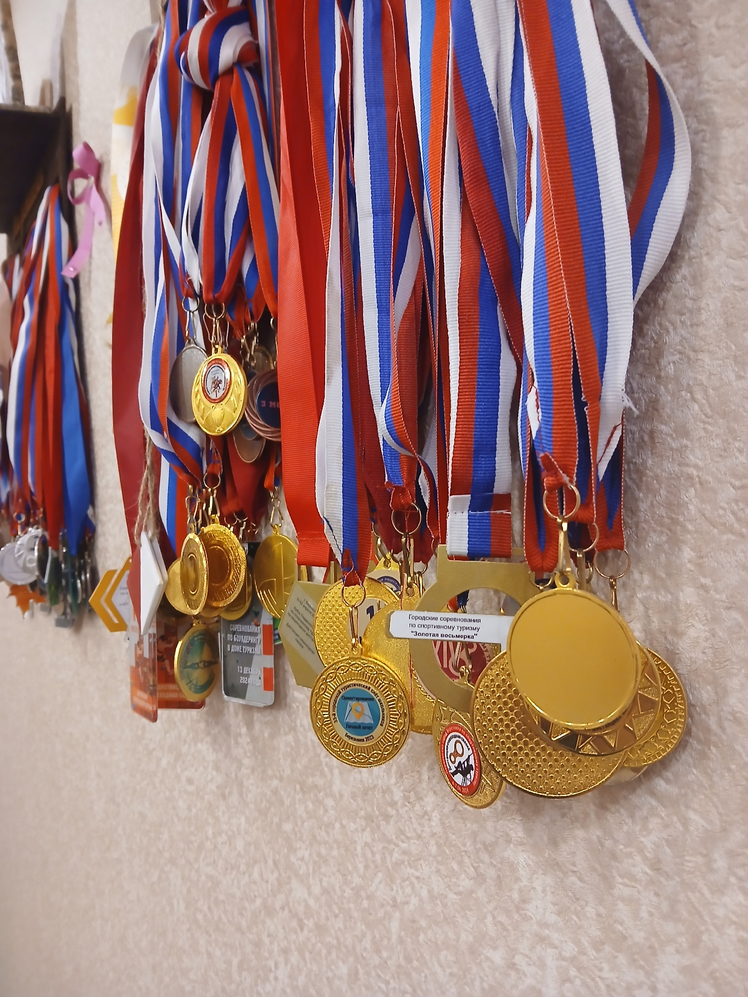 The image shows a collection of gold medals hanging on ribbons with the colors of the Russian flag (white, blue, and red). Some medals have labels indicating they were awarded at competitions for spor…read more