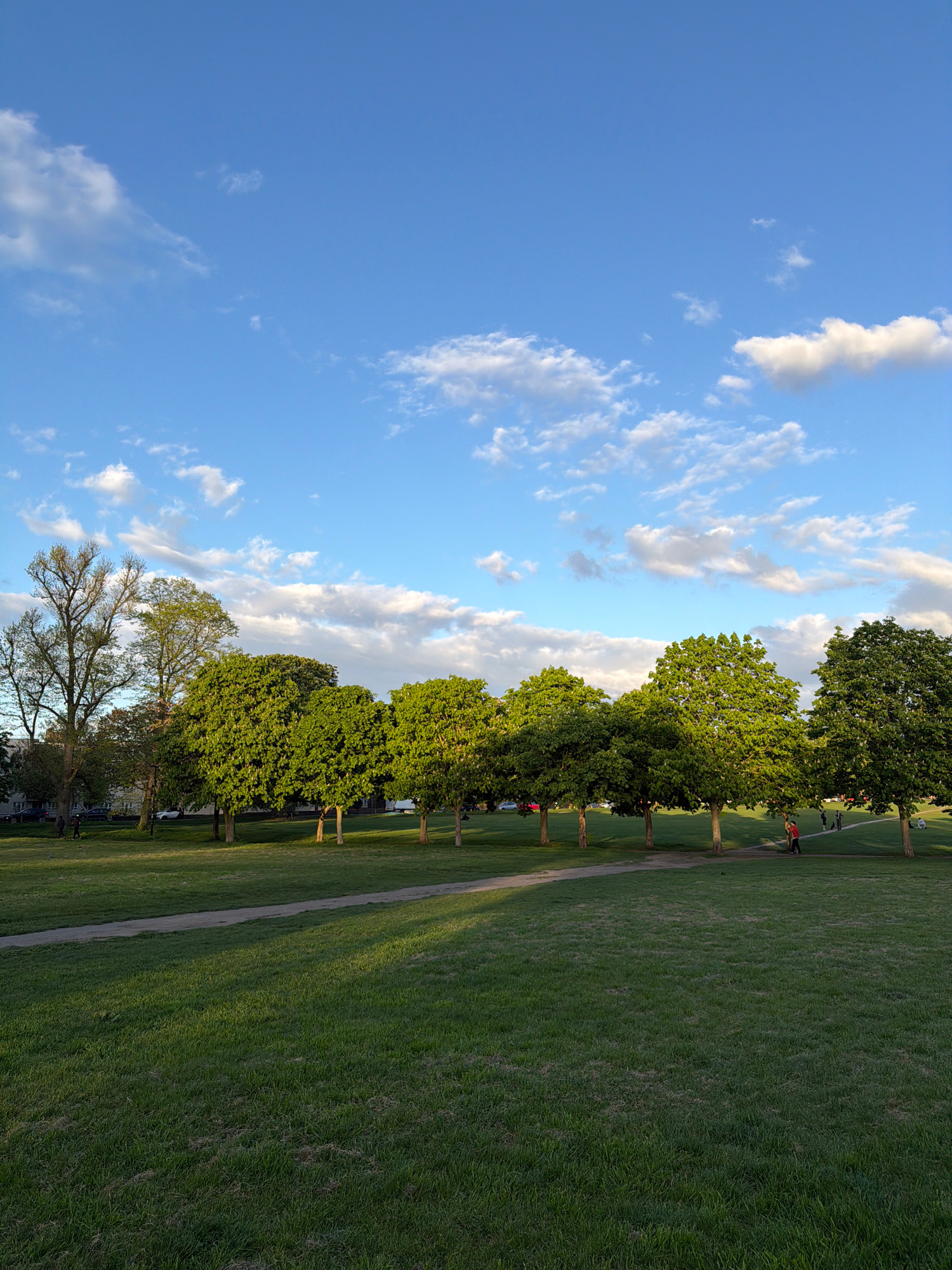 The image shows a park in London, United Kingdom. A row of trees separates a large grassy area from a blue sky with scattered clouds. People and cars are faintly visible among the trees. A dirt path r…read more