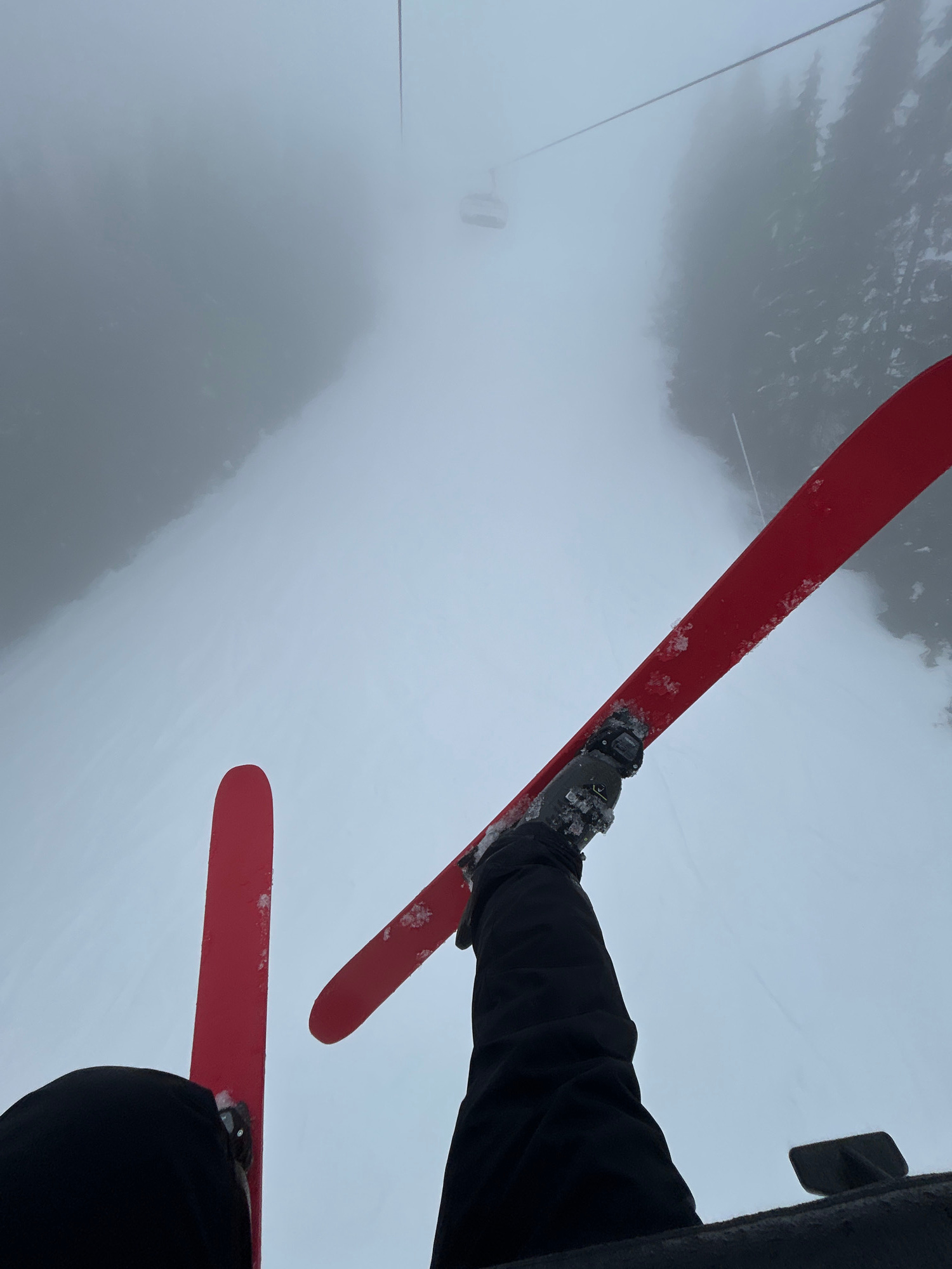 The photograph captures a skier riding a ski lift in foggy conditions. The skier is wearing black ski pants and boots, attached to red skis covered with light snow. The view is from the skier's perspe…read more