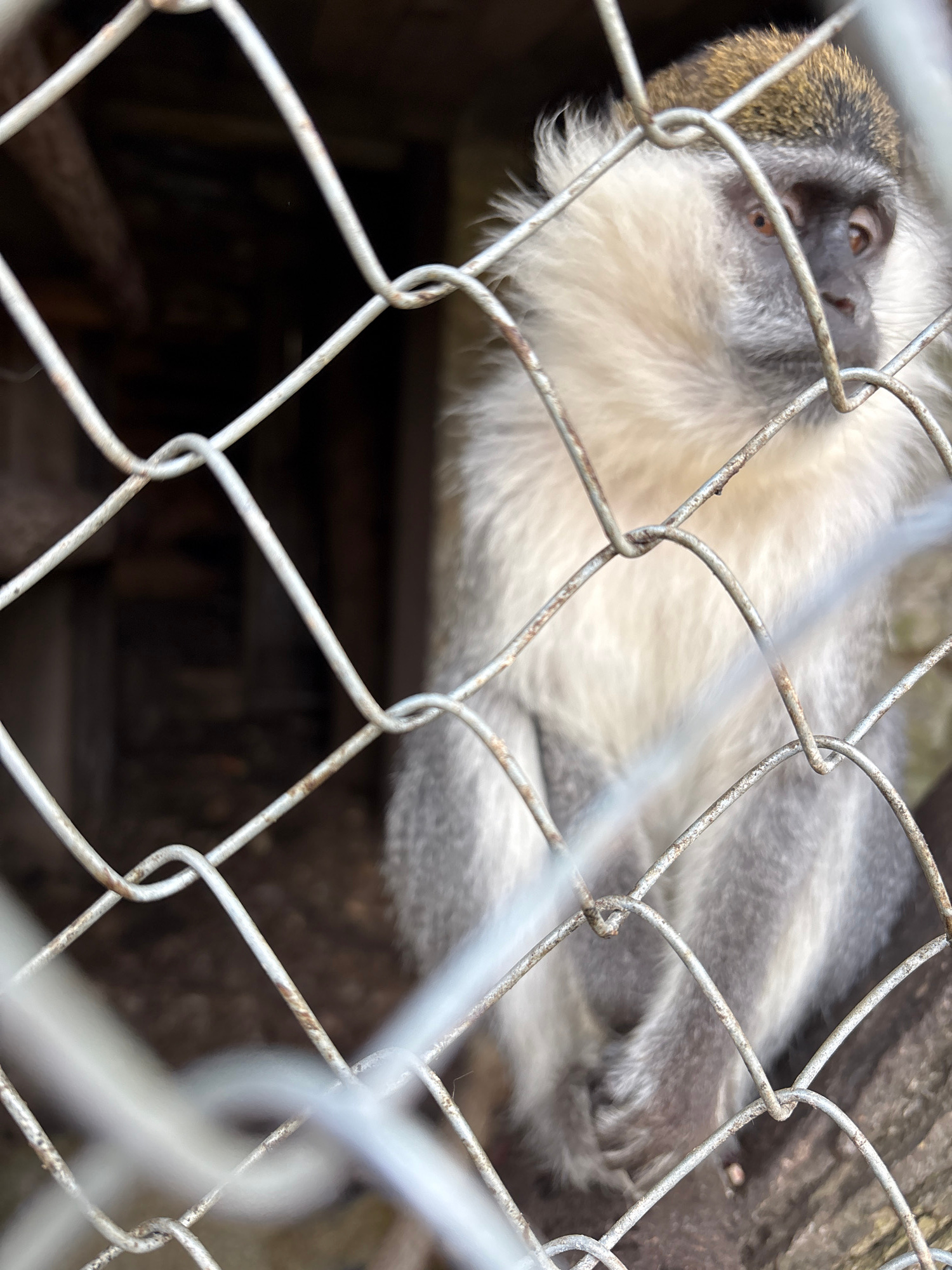 A monkey is observed behind a wire fence. The location is Goritsa, Bulgaria. The monkey has grey fur on its back and a white belly. The cage is in a dark, enclosed area. The foreground of the image isβ¦read more
