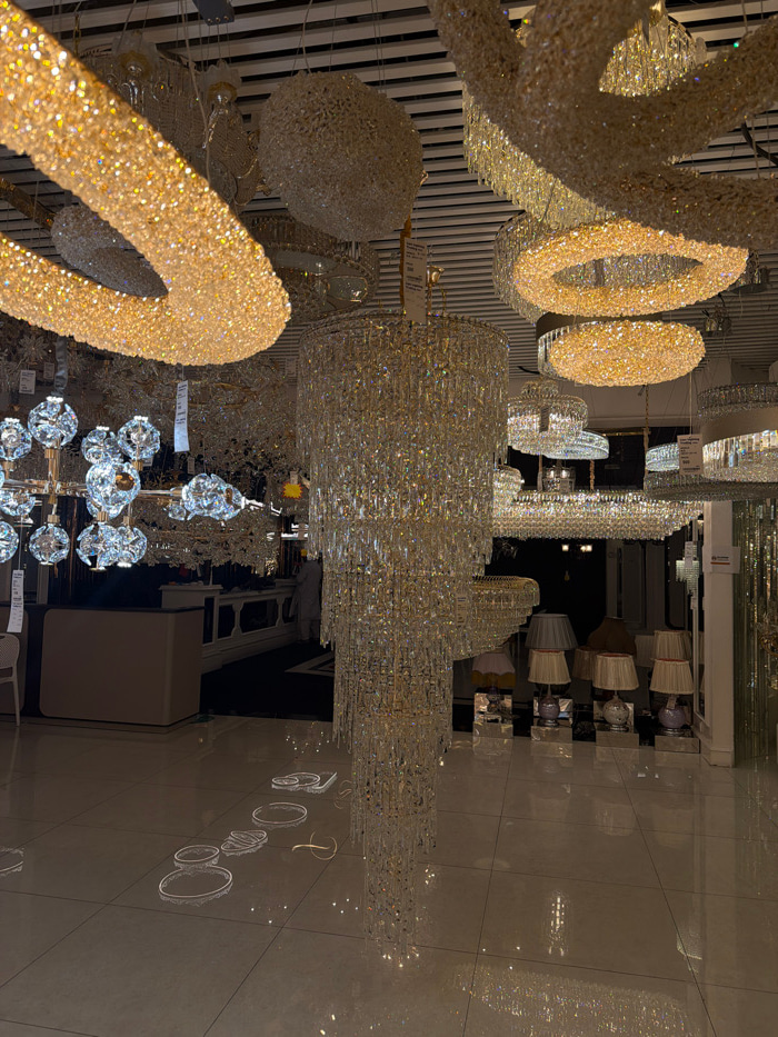 This photo showcases a variety of crystal chandeliers in a store setting. Several ring-shaped chandeliers are clustered together with others of different shapes and sizes. The chandeliers are illumina…read more
