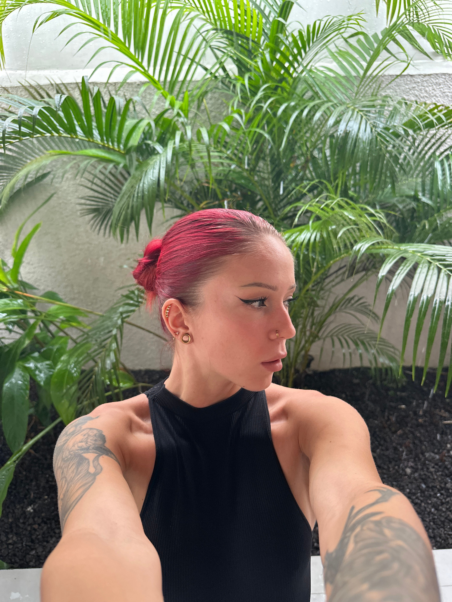 A close-up selfie captures a person with vibrant pink/red hair, styled in a bun at the back. She is positioned against a lush backdrop of tropical green palm fronds and other leafy plants, suggesting…read more