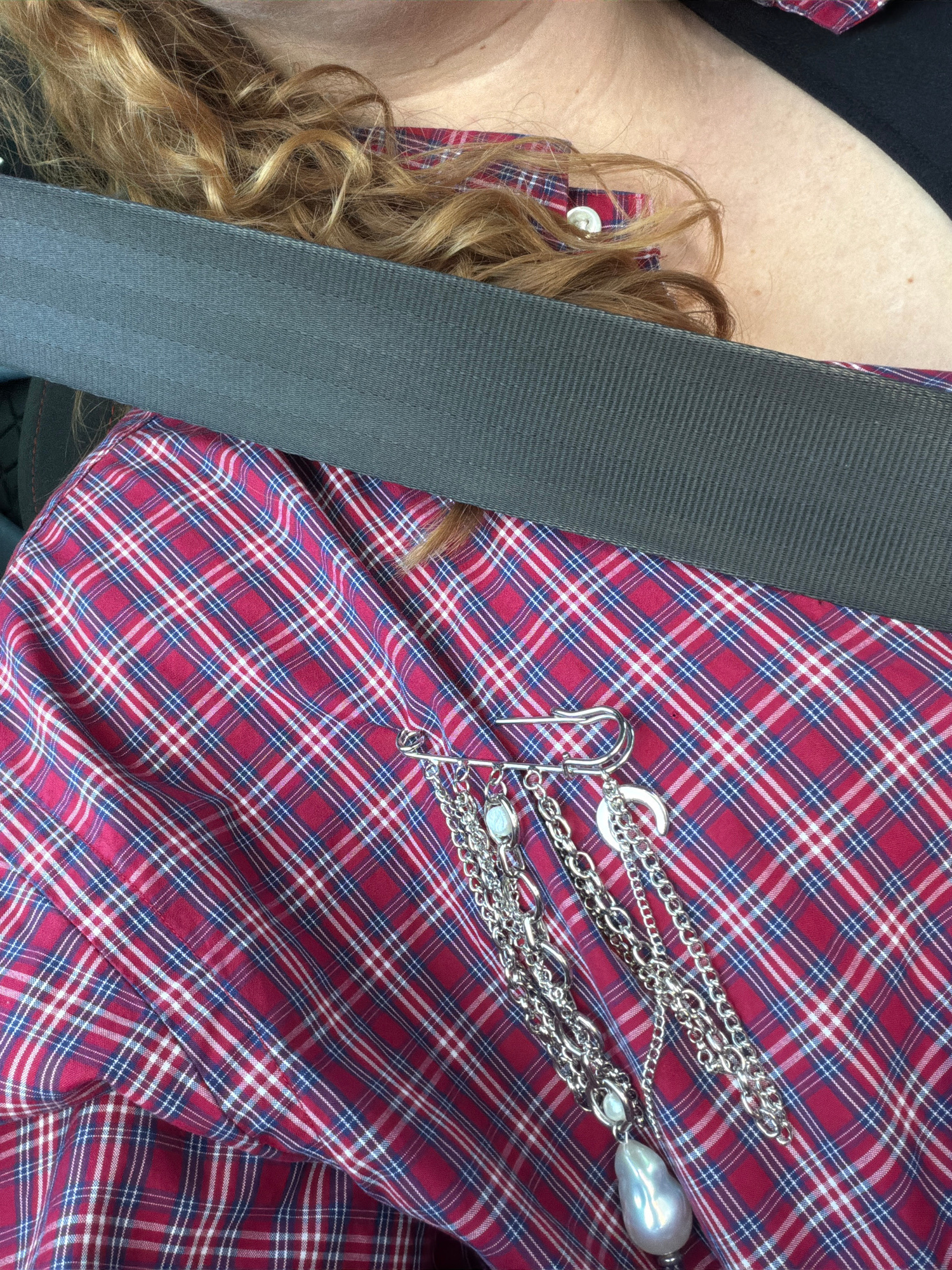 The image presents a downward, close-up view of an individual seated within a vehicle in Ramat Gan, Israel. The upper left portion of the frame shows a mass of wavy, light brown hair, adjacent to an a…read more