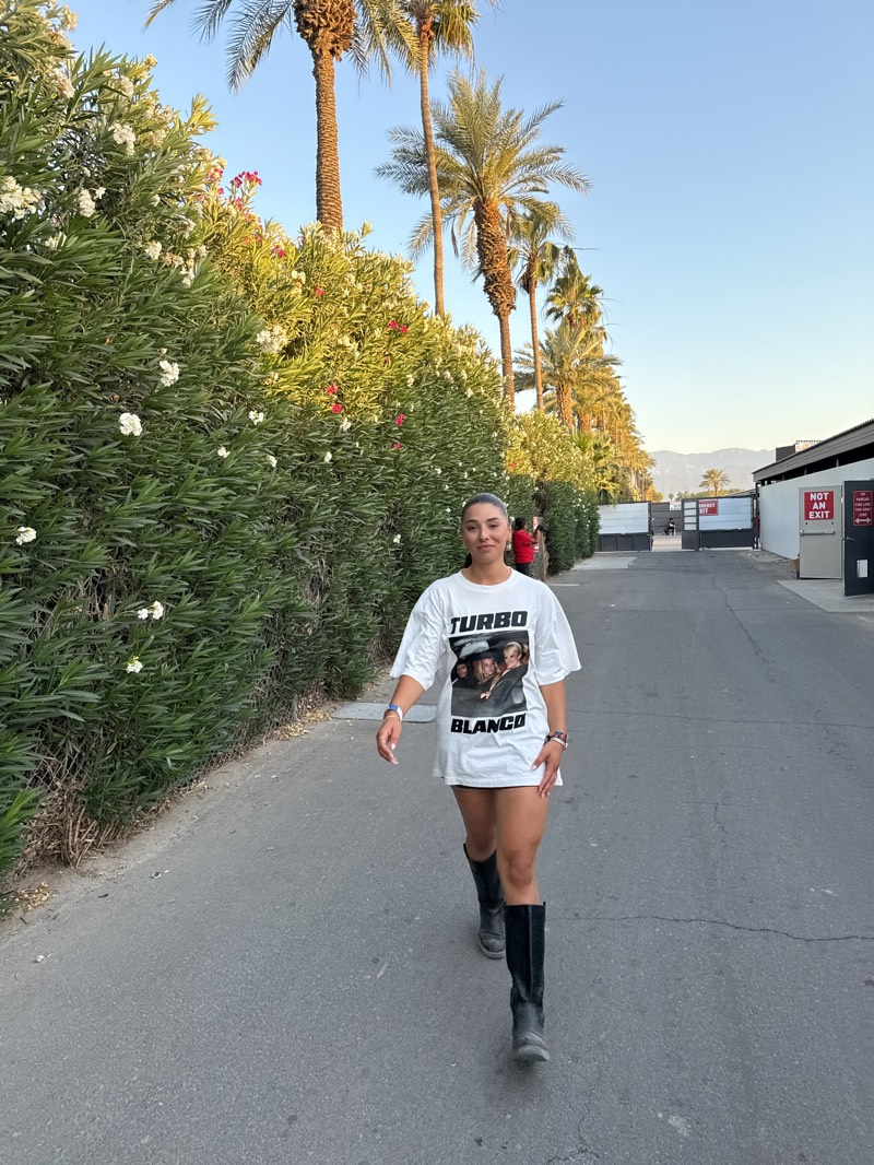 A full shot captures a woman on a street in Indio, California. She is walking towards the camera, wearing a large white t-shirt with the words "TURBO BLANCO" and an image printed on it, along with bla…read more