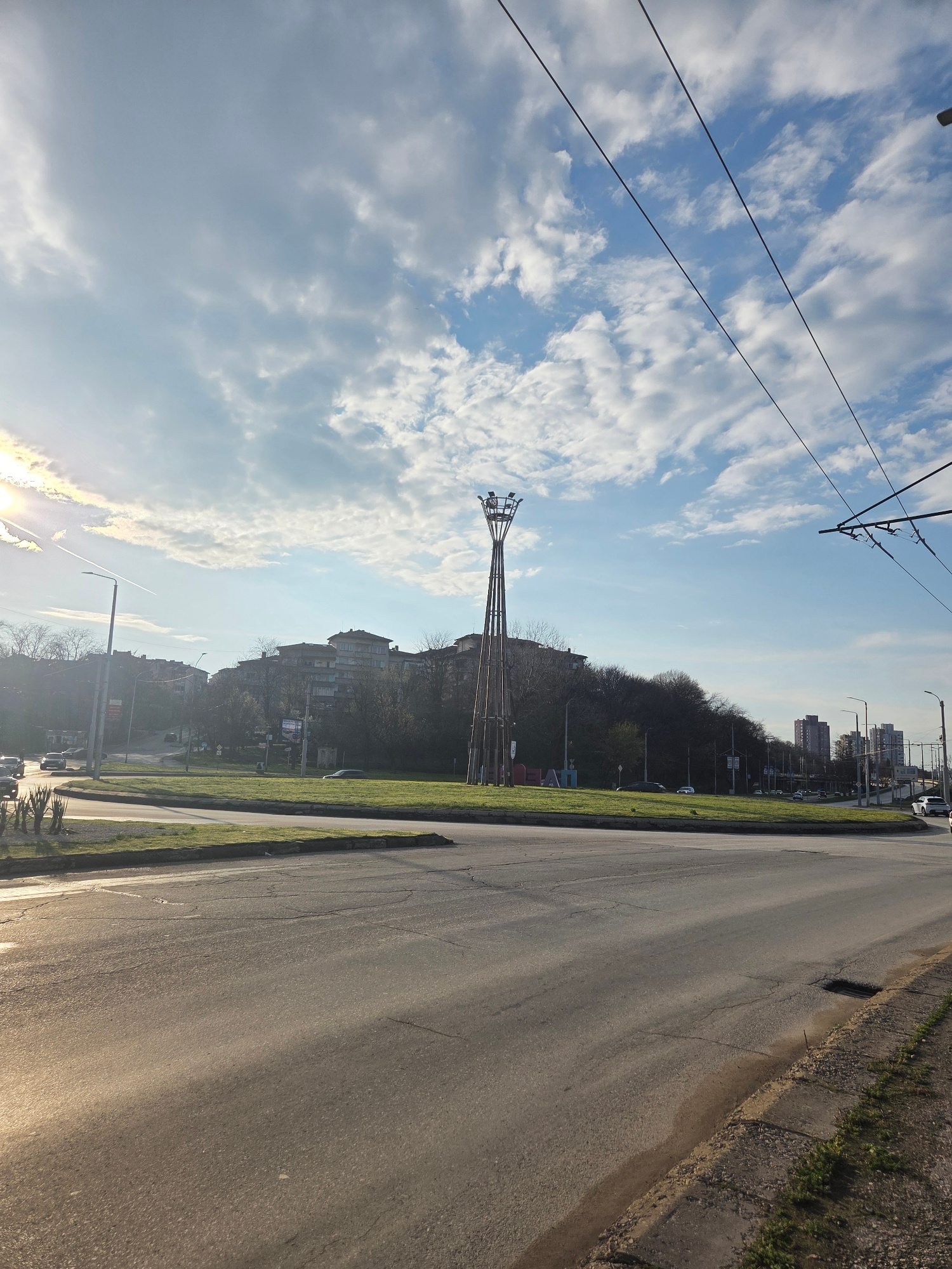 The image shows an outdoor urban scene in Pleven, Bulgaria. The view is of a street with a sidewalk and green areas, likely a park or grassy median, alongside the road. A distinctive metal communicati…read more