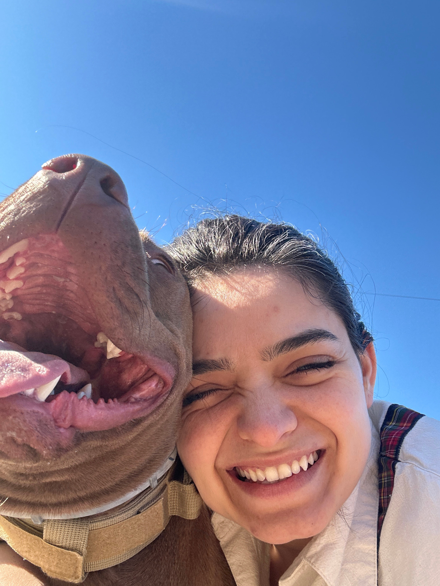 A low-angle close-up captures a smiling woman with closed eyes and a dog with its mouth wide open. The woman has dark hair with some gray strands, a white shirt with a plaid collar detail, and is posi…read more