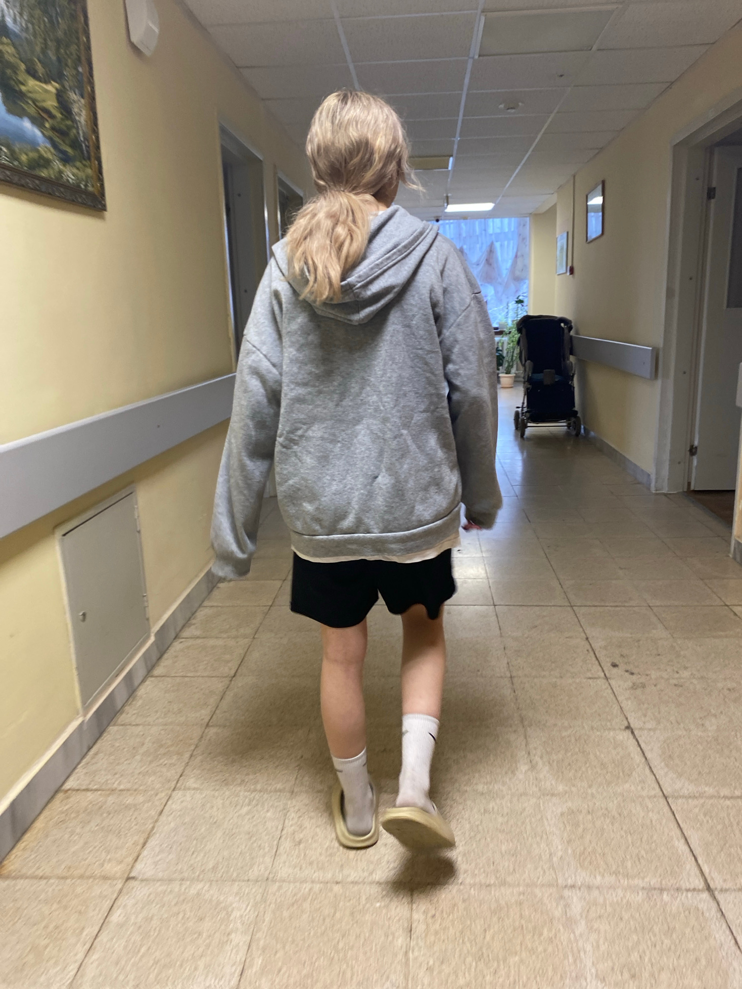 A person is standing in a hallway. They are wearing a gray hoodie, black shorts, white socks, and light-colored sandals. The hallway has tile floors and light yellow walls. A wheelchair is visible fur…read more