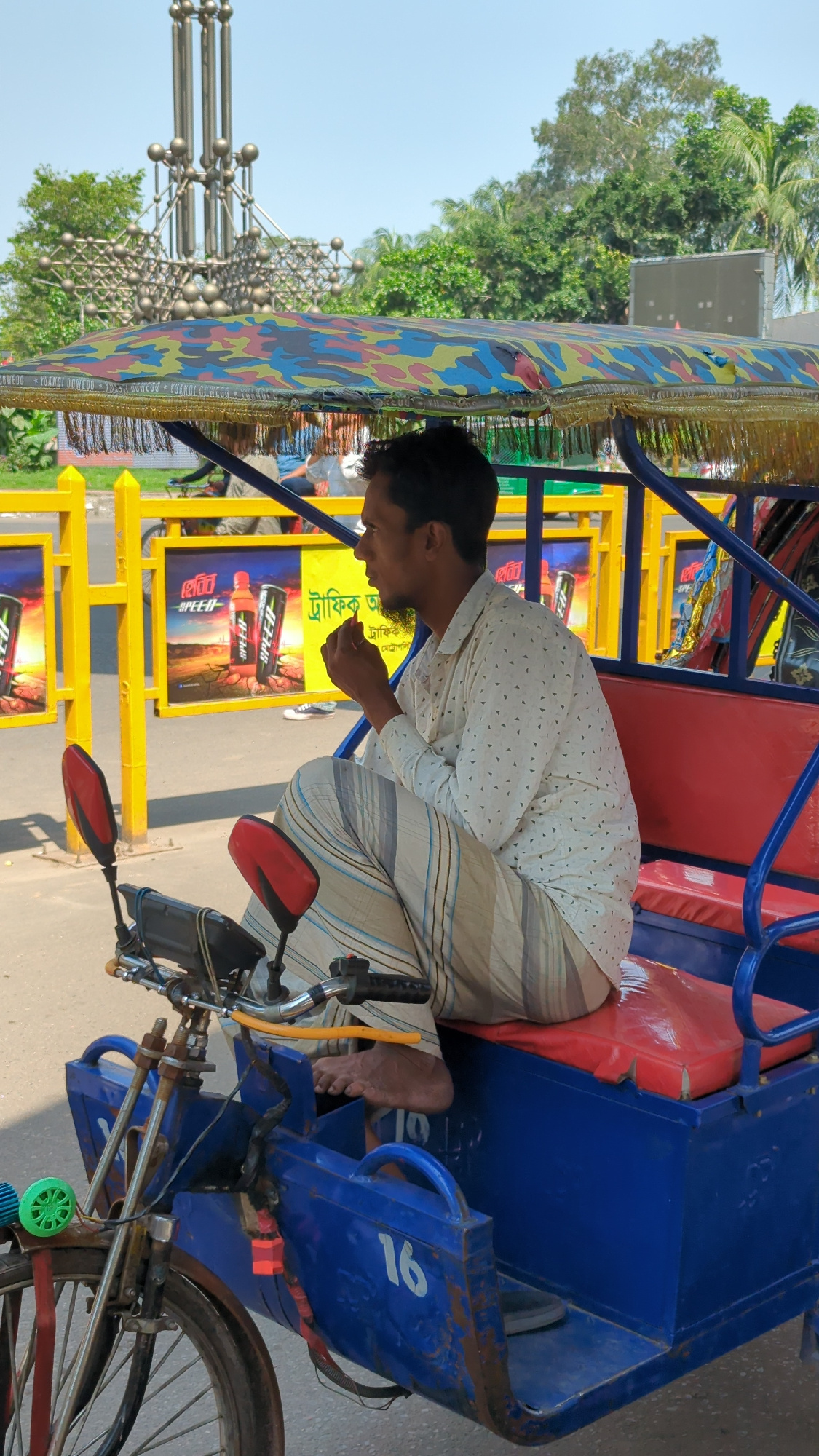 A barefoot, seated man in a white patterned shirt and striped lungi is in a blue and red rickshaw with yellow framing near the Shahid Minar monument in Dhaka, Bangladesh. He is looking down and appear…read more