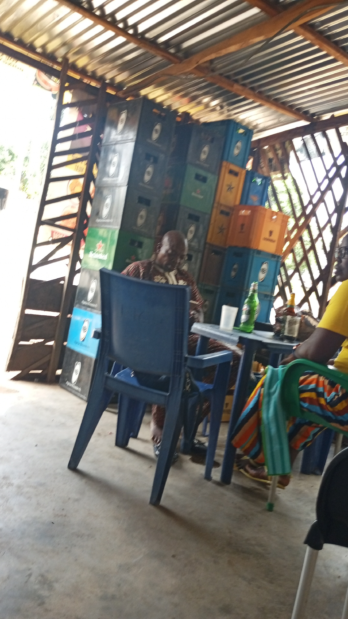 The image depicts an outdoor bar in Zango-ndaji, Nigeria. Two individuals are seated at a square plastic table. One person, wearing a brown patterned shirt, is seated in a blue plastic chair. The seco…read more