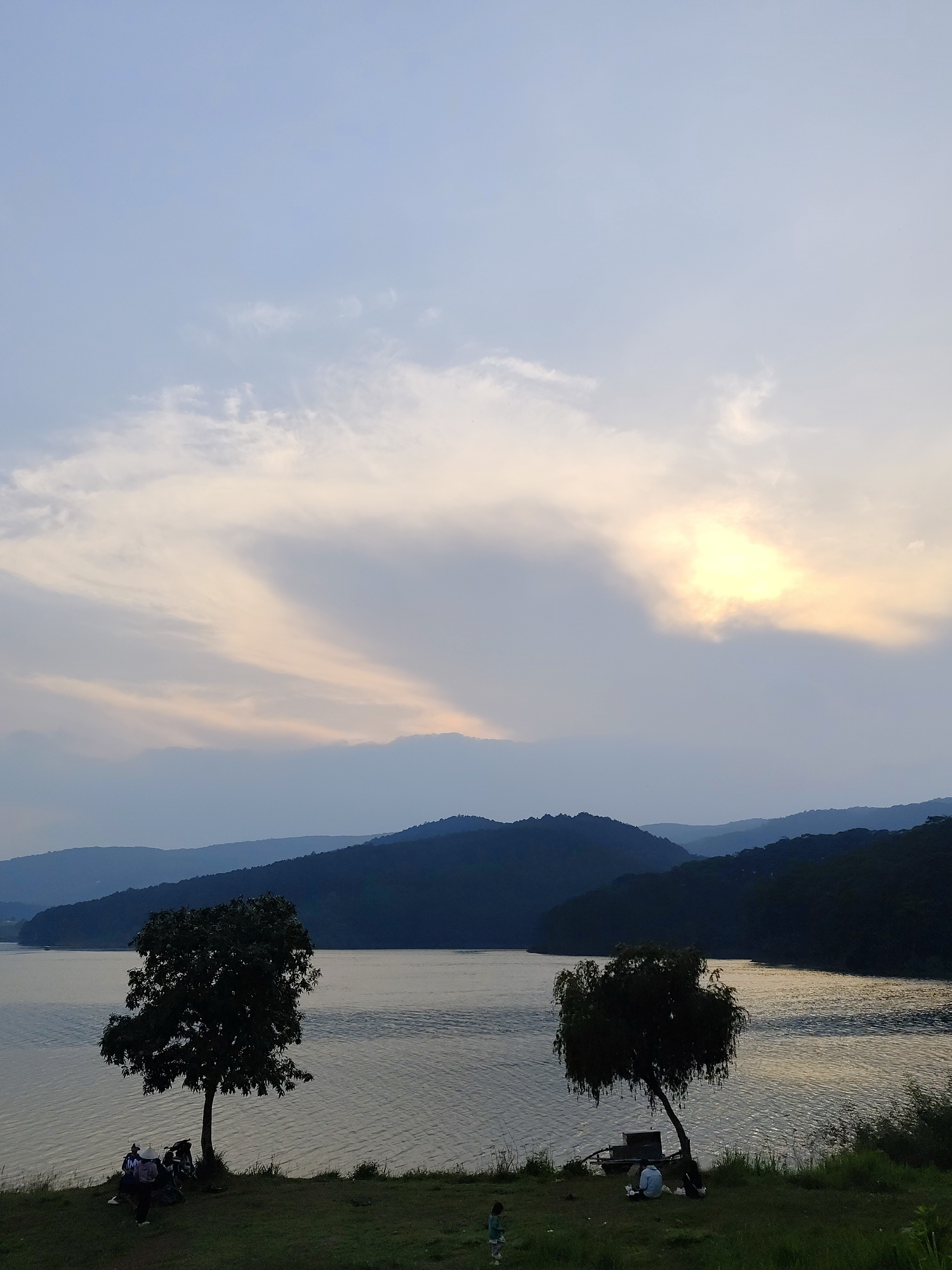 The image shows a scenic view of a lake surrounded by hills in Da Lat, Vietnam. The sky is overcast with a hint of sunlight breaking through the clouds. Two trees are in the foreground on a grassy ban…read more