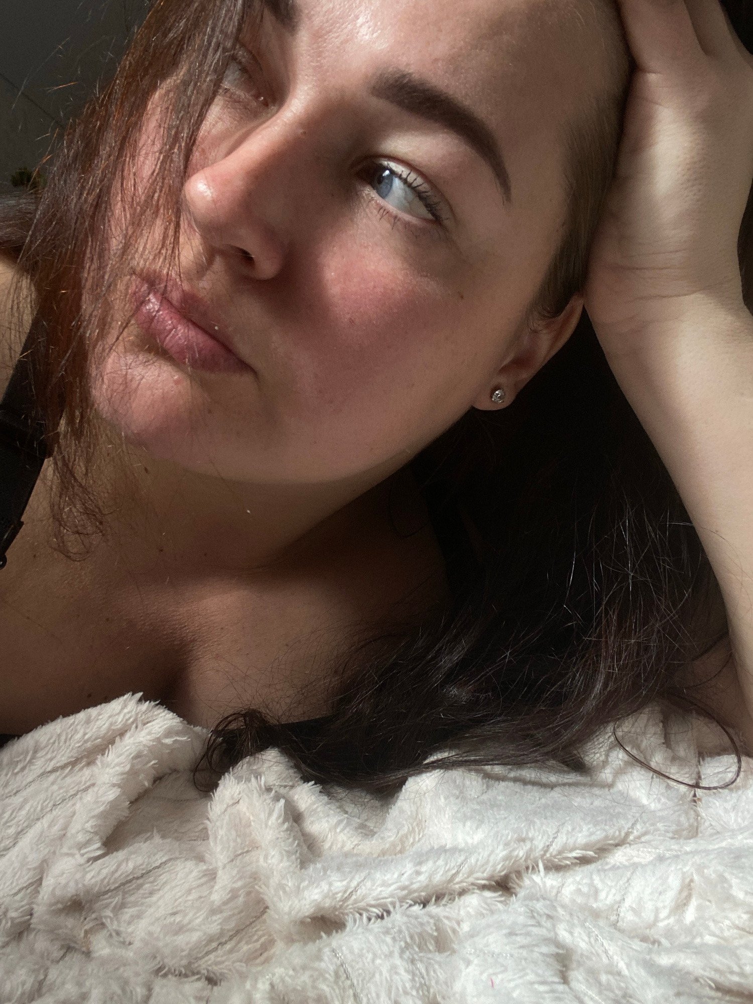 A woman is lying on a white, furry blanket. She has dark hair and is wearing a dark top. Her head is tilted to the left, and her left hand is resting on her forehead. The background is dark. There is…read more