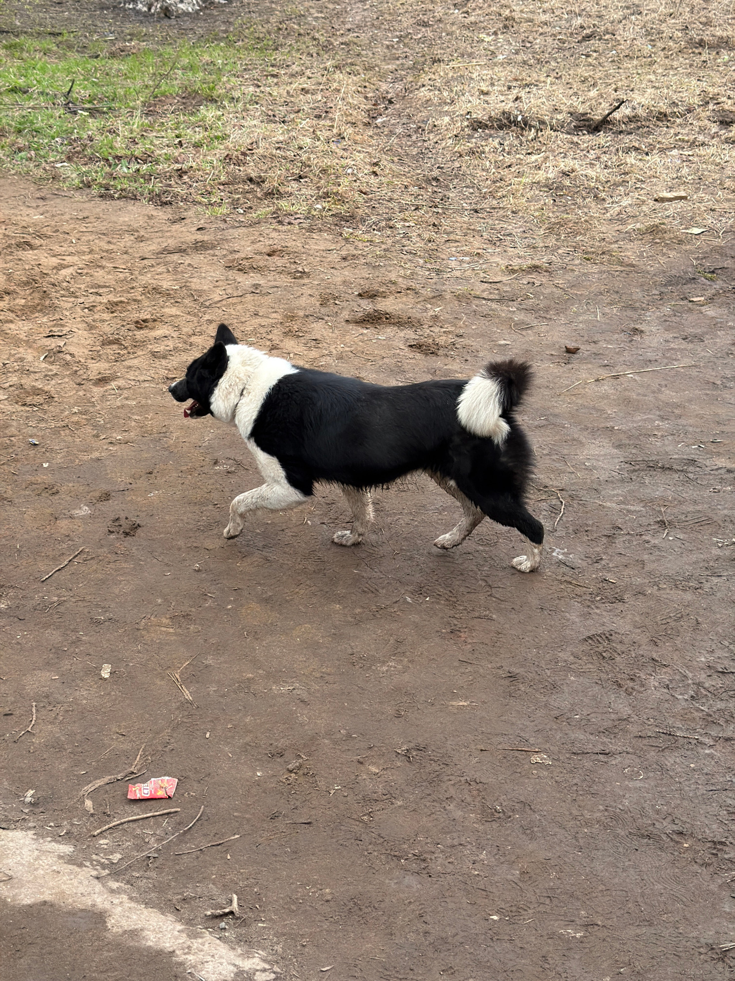 The image depicts a black and white dog standing on dirt ground. The location and city are not discernible from the image. The dog is facing to the left of the frame, its body angled slightly upwards.…read more
