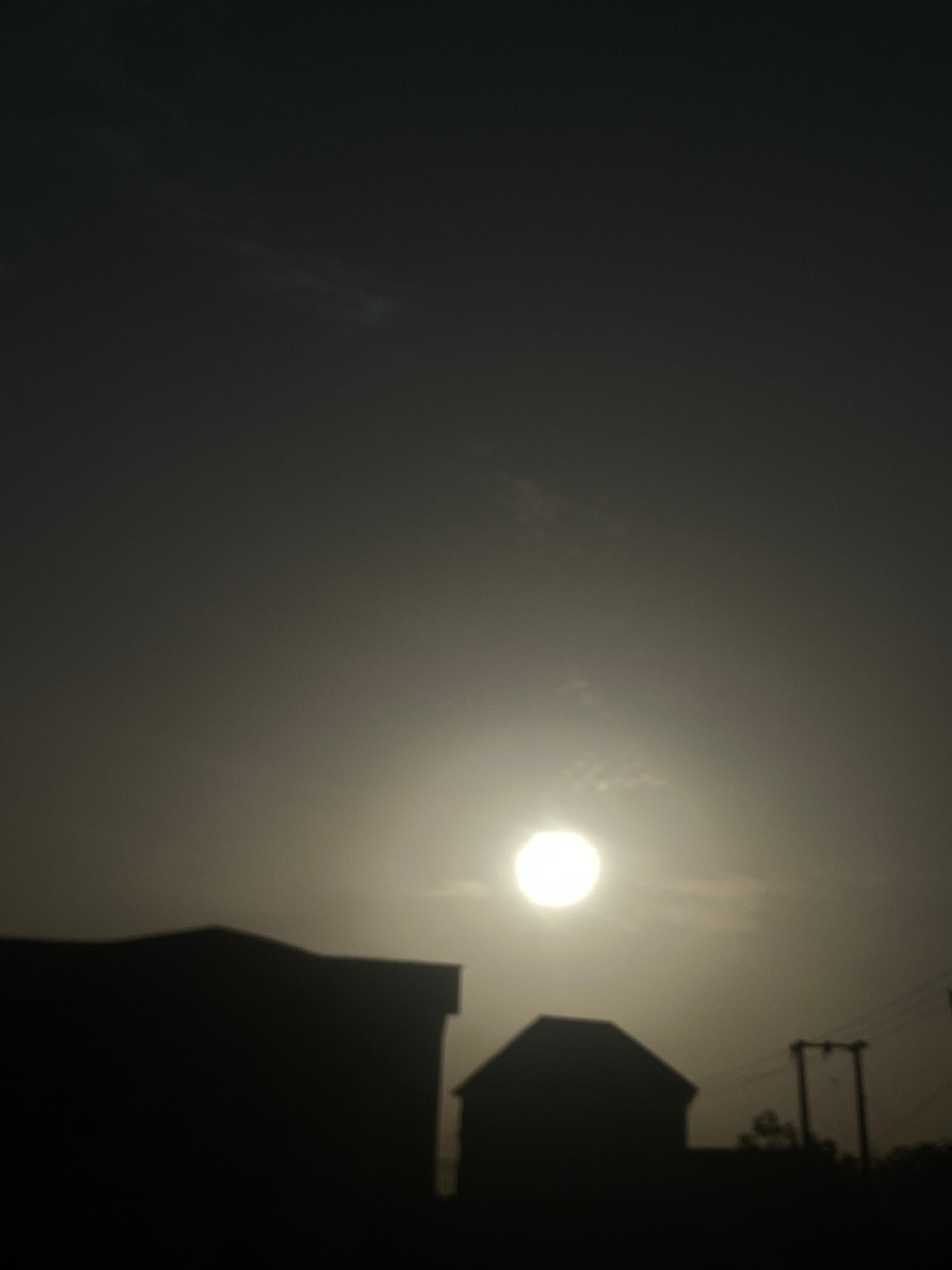 The image, taken in Kwarbai B, Nigeria, captures a hazy outdoor scene dominated by a brilliant, diffused sun. The sun appears as a bright, circular disc, positioned towards the upper right, suggesting…read more
