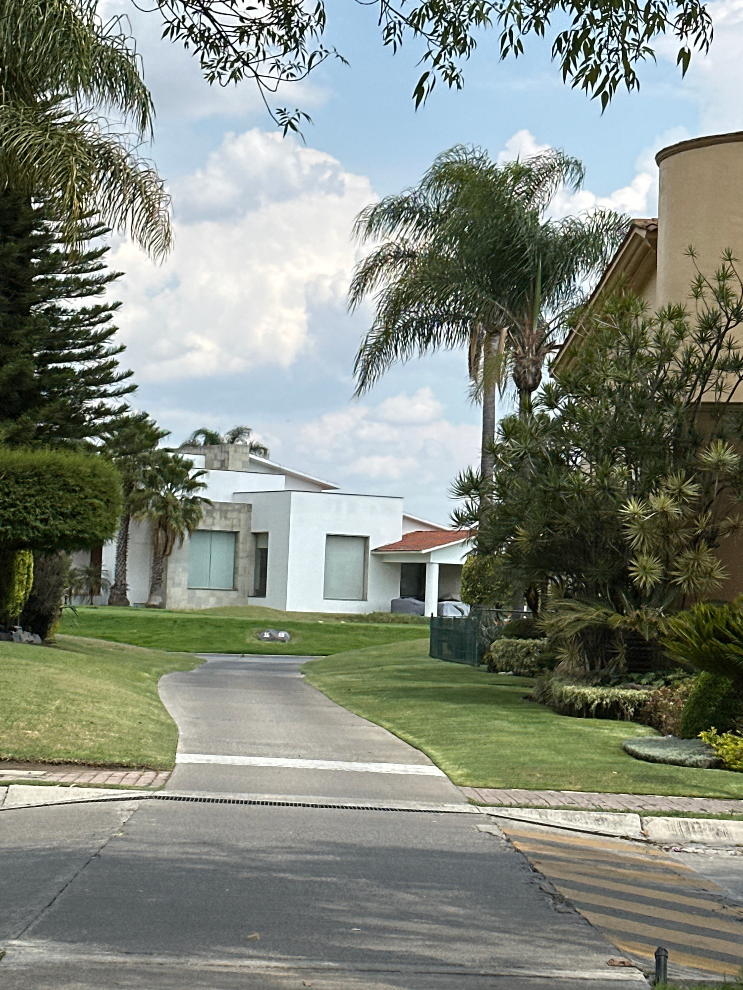 The image depicts a residential street in San Bernardino Tlaxcalancingo, Mexico. The street has a sidewalk, a grass strip, and a road with yellow and black hazard markings at the edge. A modern white…read more
