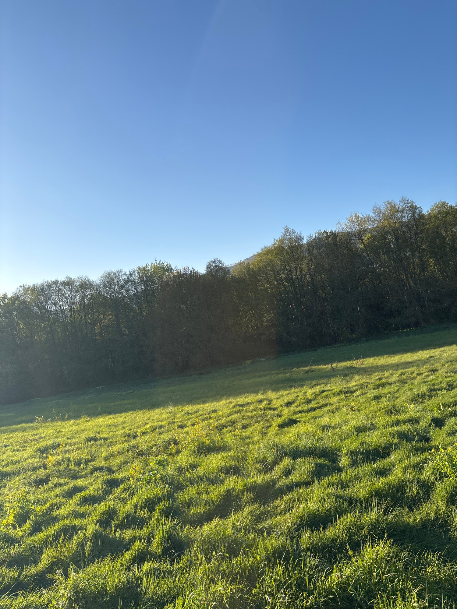 A landscape photograph showing a bright, clear blue sky occupying a large portion of the image, contrasting with a line of trees bordering a green field. The trees appear dense, forming a natural barr…read more