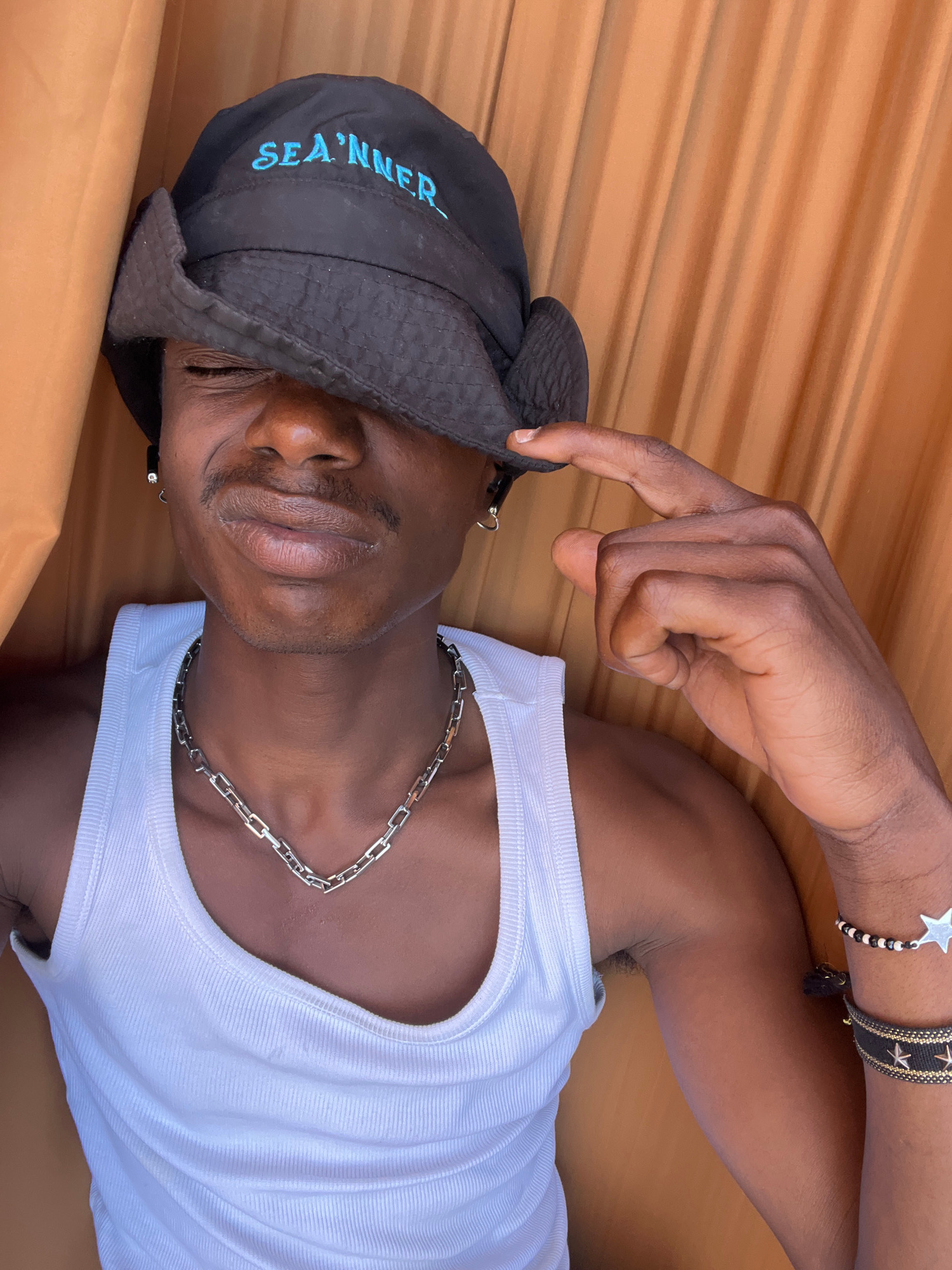 A medium close-up shot captures a person lying down, their body oriented diagonally across the frame. The subject has dark skin and is wearing a white, ribbed tank top and a black bucket hat. A silver…read more