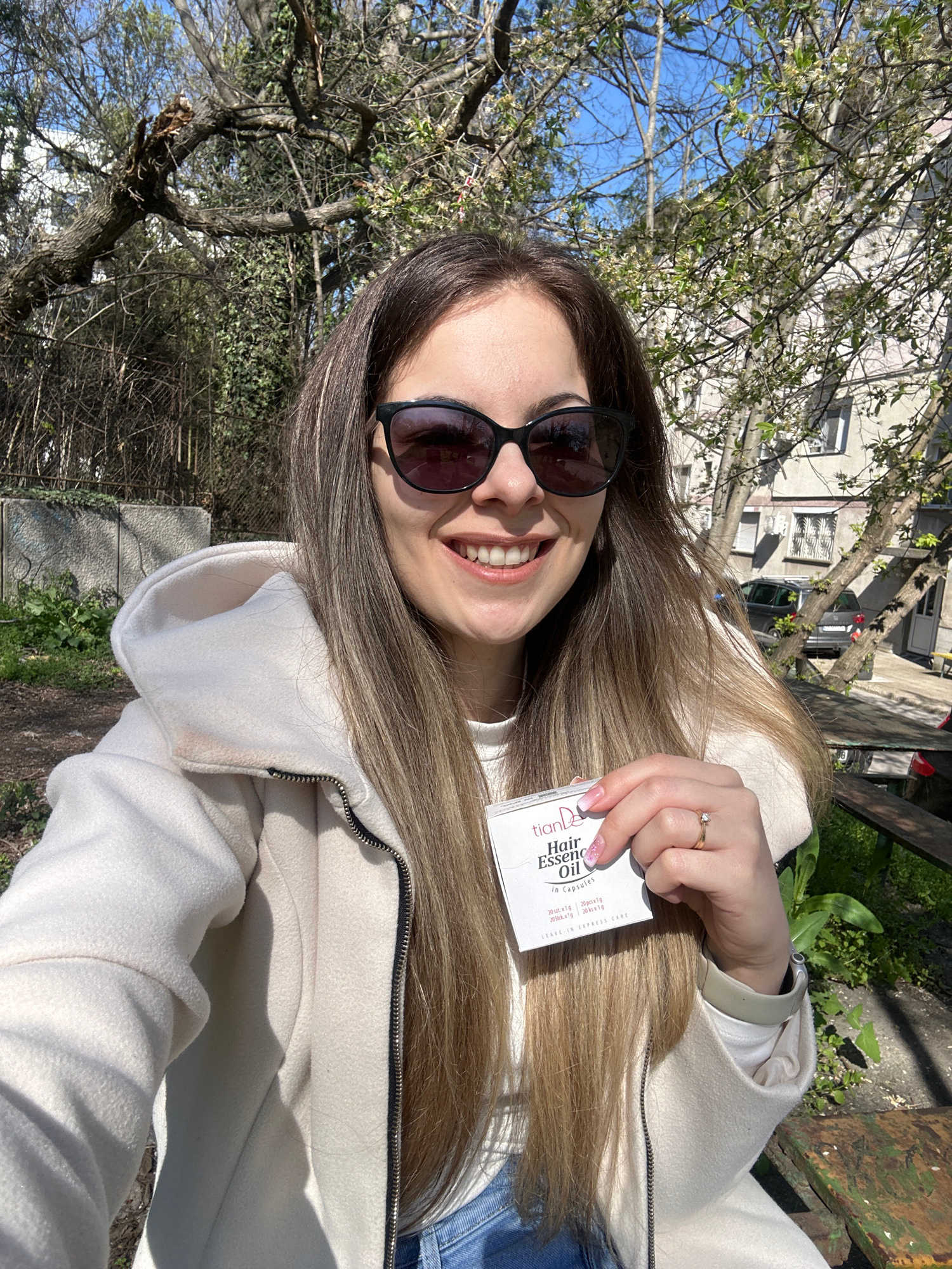 The image shows a woman with long blonde hair and sunglasses smiling while holding a product labeled "TianDe Hair Essence Oil" in front of an outdoor setting. The product is white with black lettering…read more