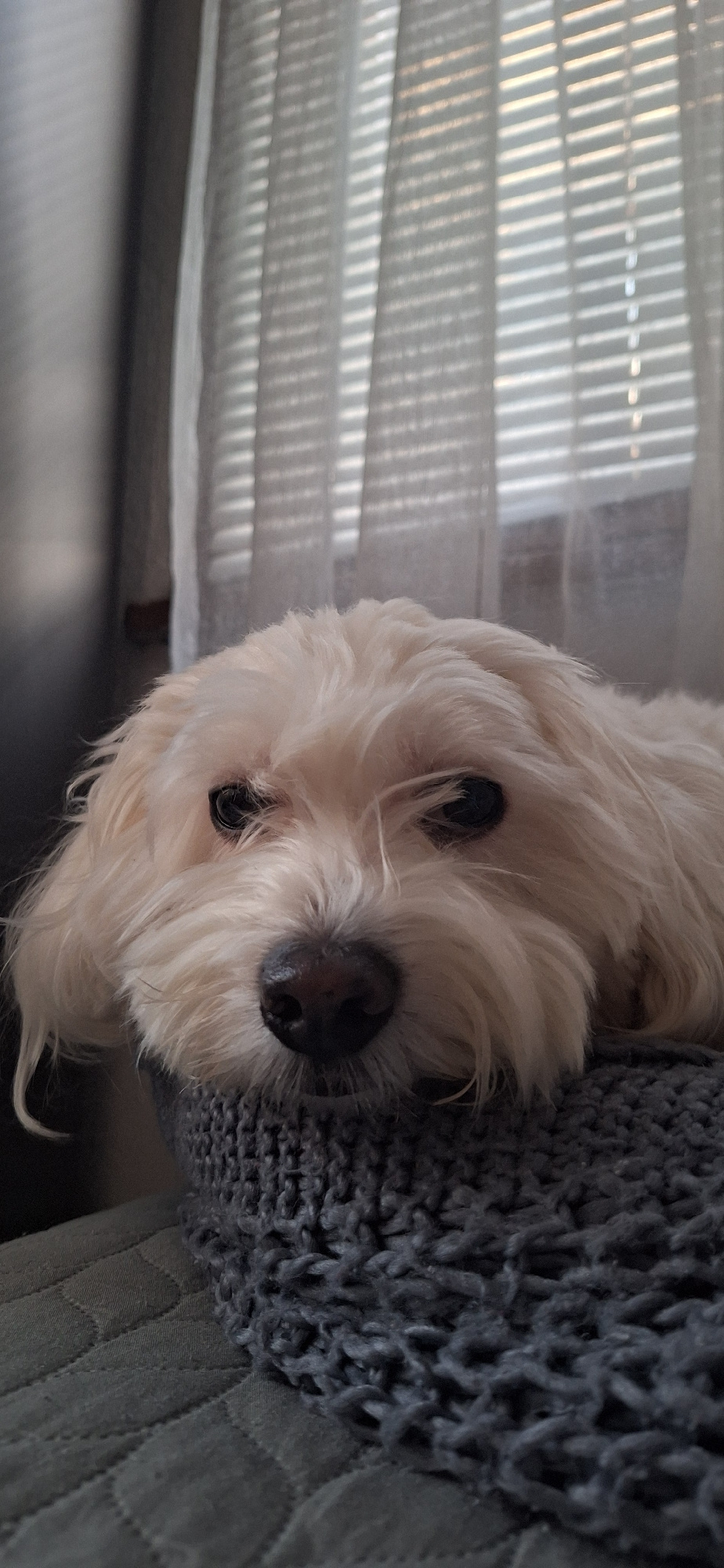 A small, white, long-haired dog is resting its head on a textured gray knit blanket. The background includes a sheer, white window covering with horizontal lines. The location is undeterminable as it…read more