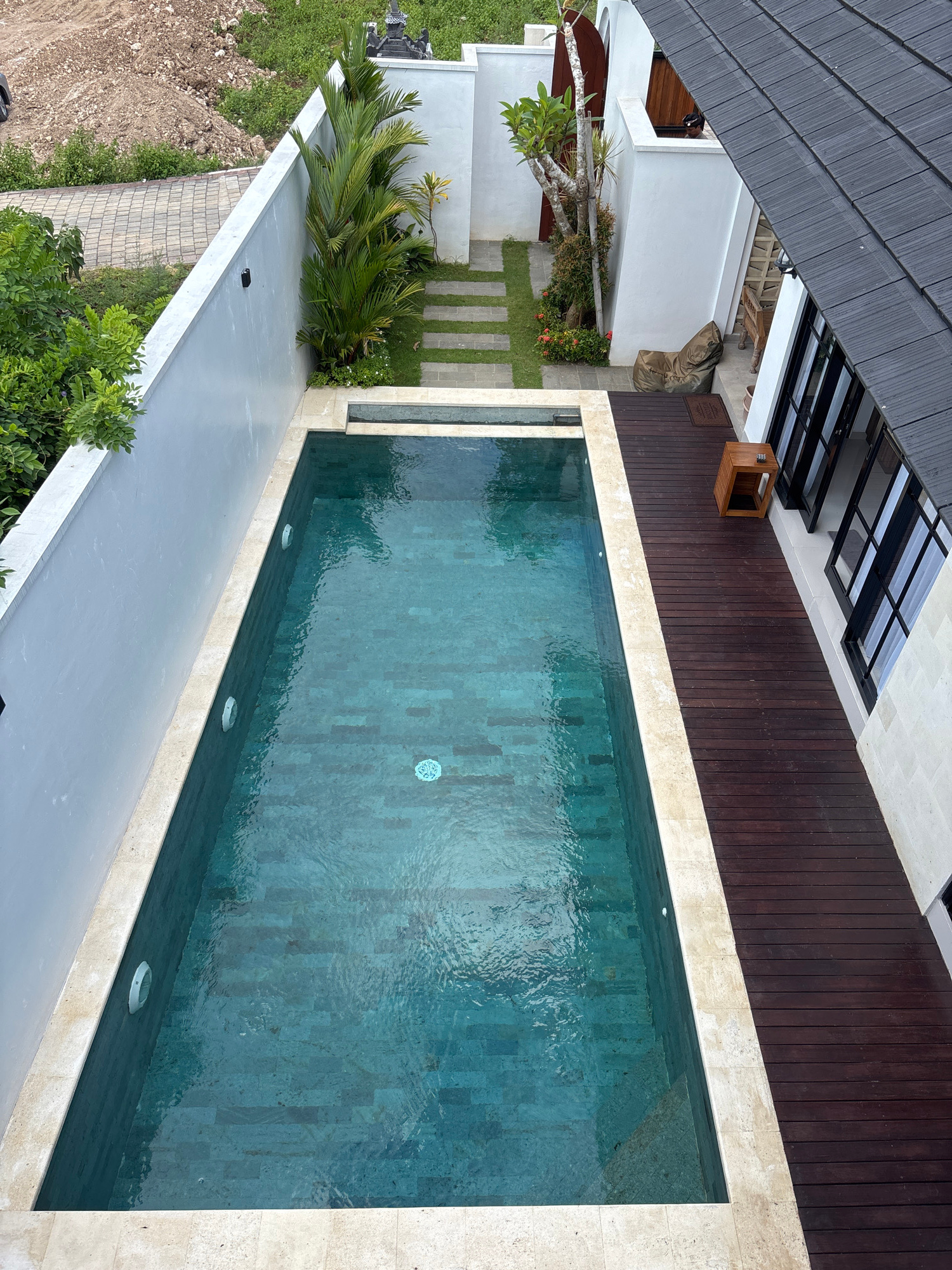 This high-angle photograph depicts a swimming pool and surrounding architecture in Ungasan, Indonesia. The pool, filled with turquoise water and featuring a tile bottom, is bordered by light-colored s…read more