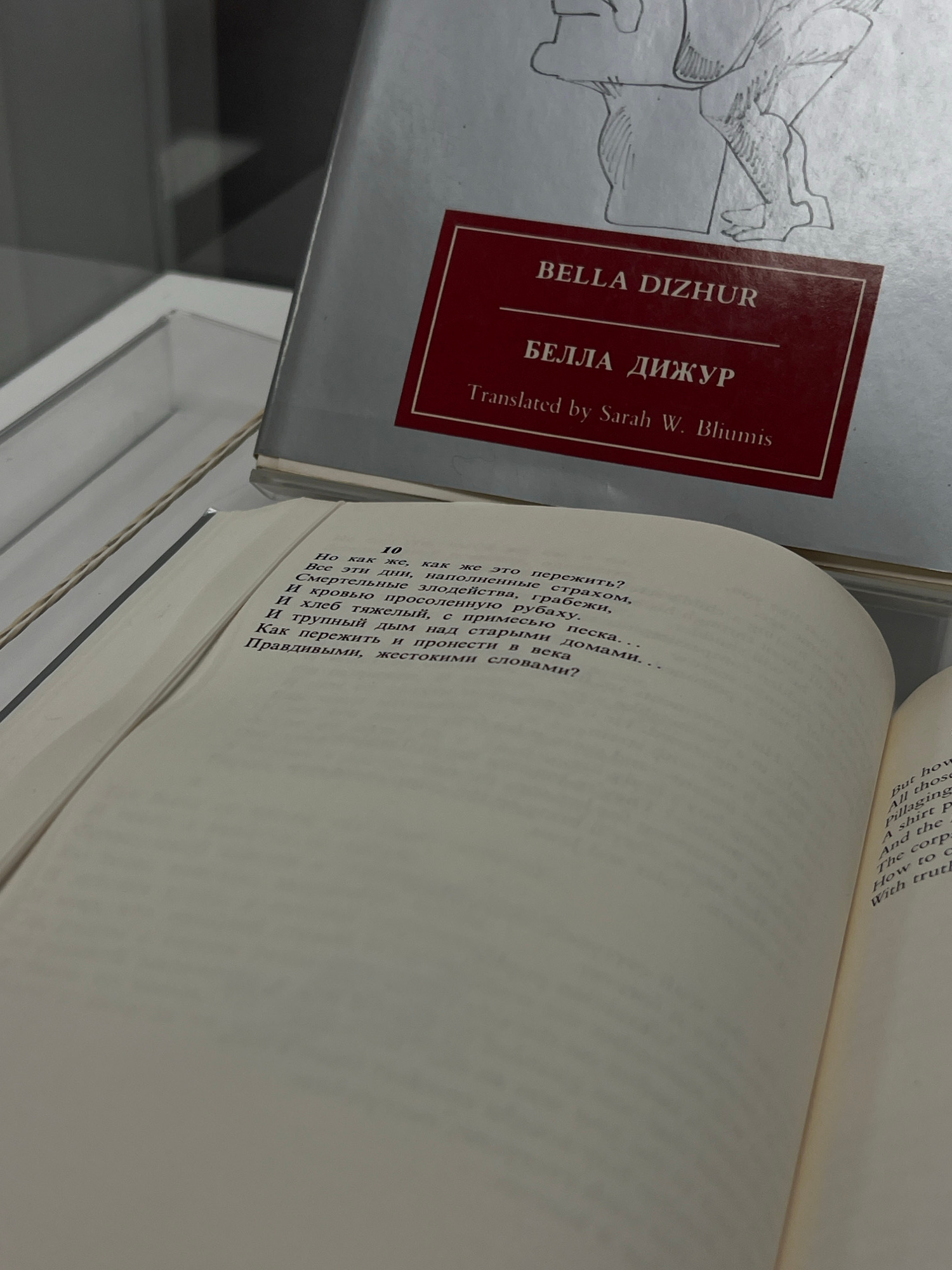 This close-up shot, taken in Yekaterinburg, Russia, features two books. In the foreground, an open book displays text on both pages. The left page shows Russian Cyrillic script, while the right page p…read more