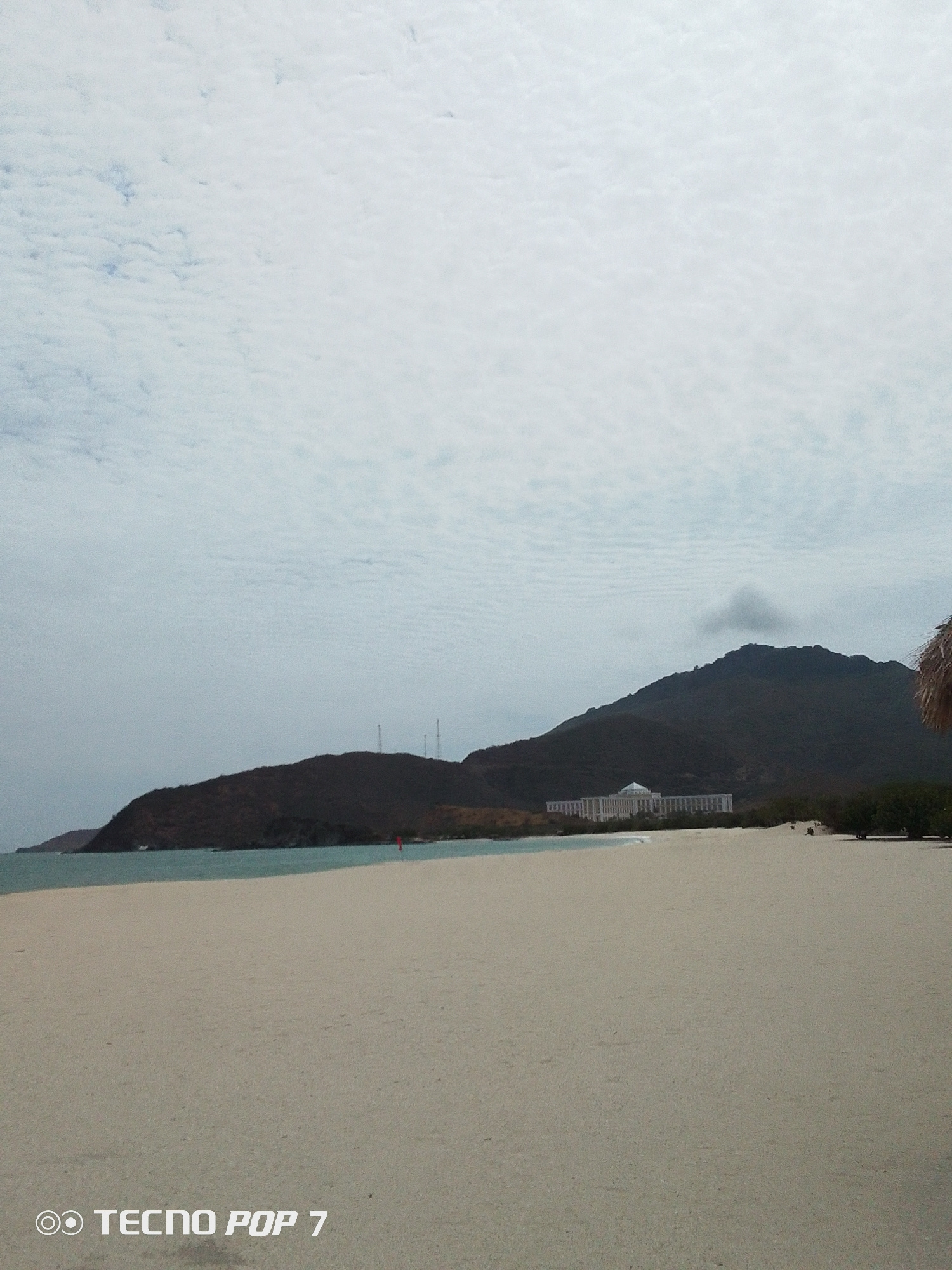 The image depicts a wide, sandy beach under a cloudy sky, likely in Pedro González, Venezuela. In the distance, a mountain range rises, with a prominent building resembling a resort or hotel situated…read more