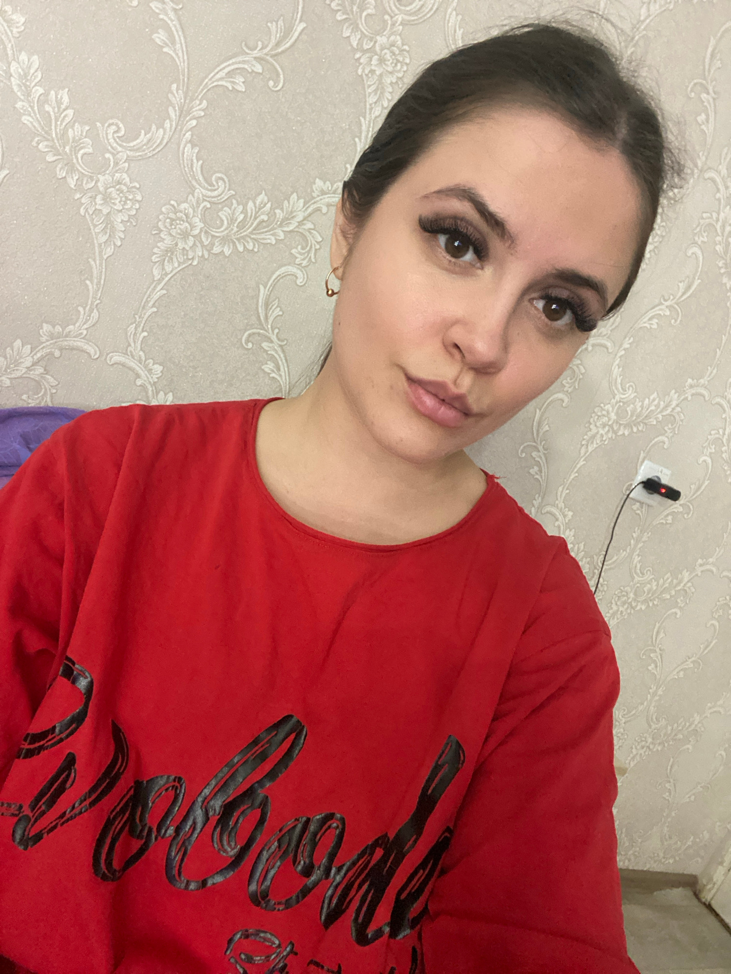 A woman is shown in a medium close-up shot, angled to the left. She has dark hair pulled back, with a fair complexion and wearing heavy false eyelashes. She is wearing a red t-shirt with black cursive…read more