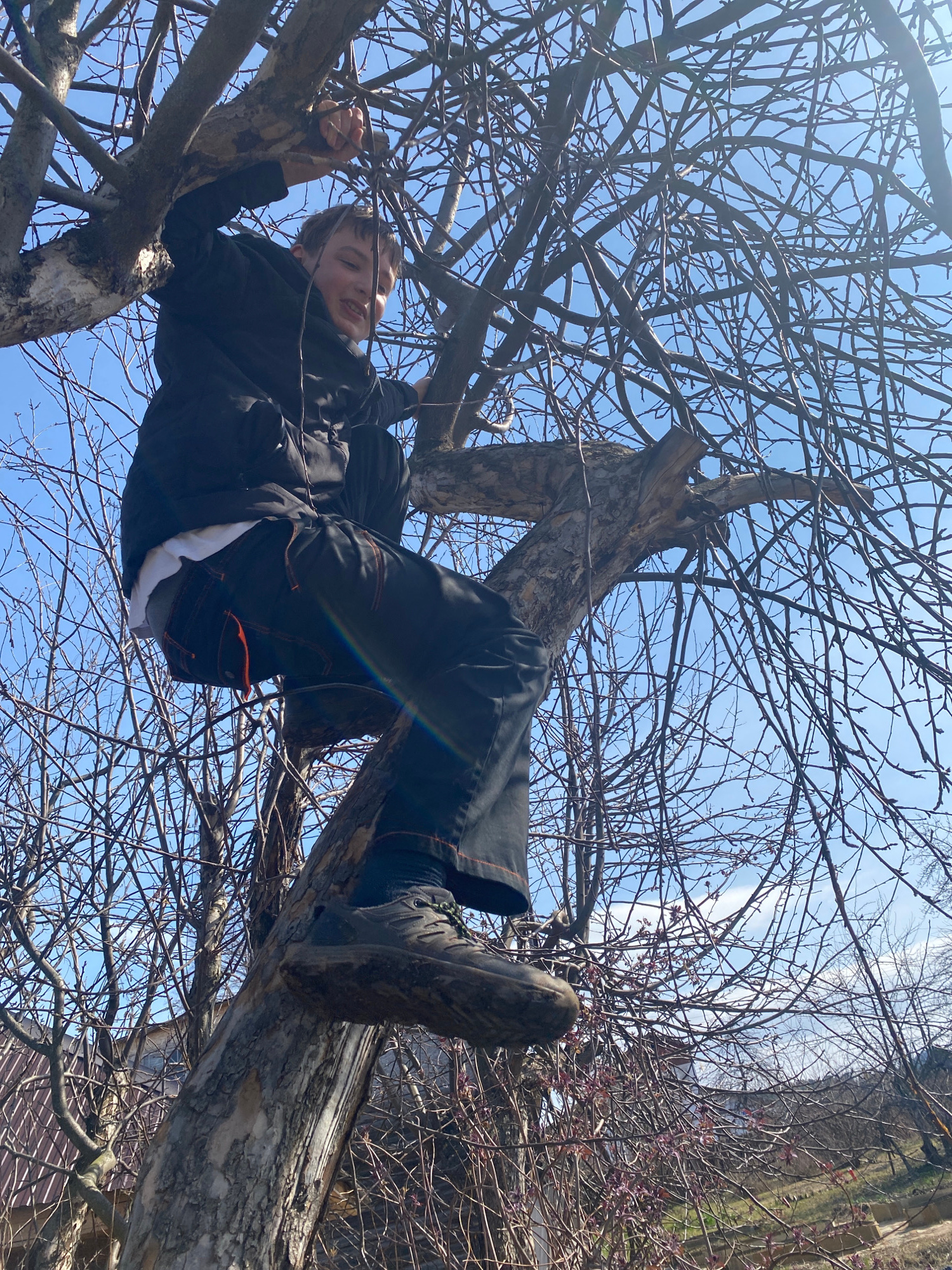 A low-angle, daytime shot depicts a young boy in a tree. The boy, wearing a dark jacket, dark pants with orange stitching, and dark shoes, is positioned amidst the bare branches of a tree against a bl…read more
