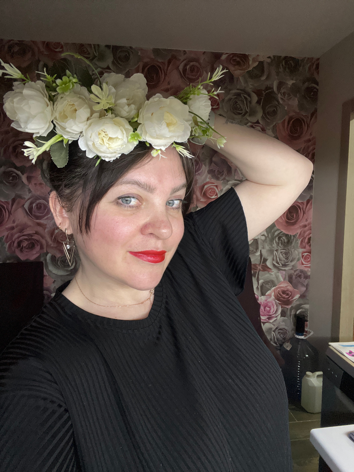 A frontal, slightly angled portrait depicts an adult female indoors in the city of Noviy, Russia. The subject has dark hair, blue eyes, and red lipstick. She is wearing a black, ribbed short-sleeved t…read more