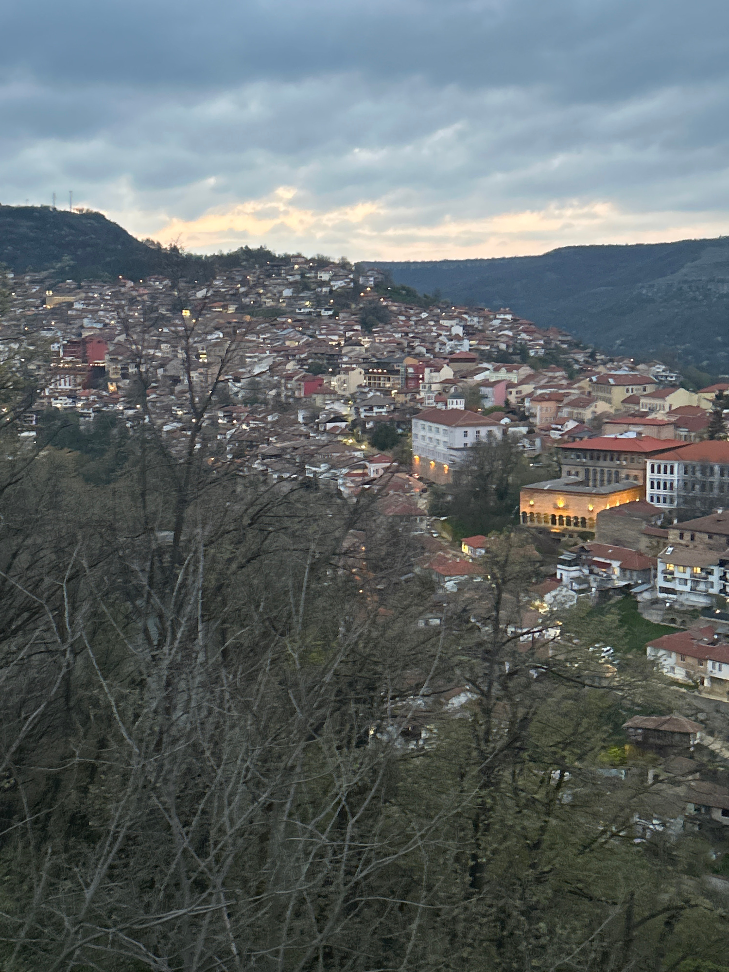 The image shows a densely populated hillside city, likely Veliko Tarnovo, Bulgaria, given the architectural style. The city is situated on a steep incline, with buildings tightly packed together, feat…read more