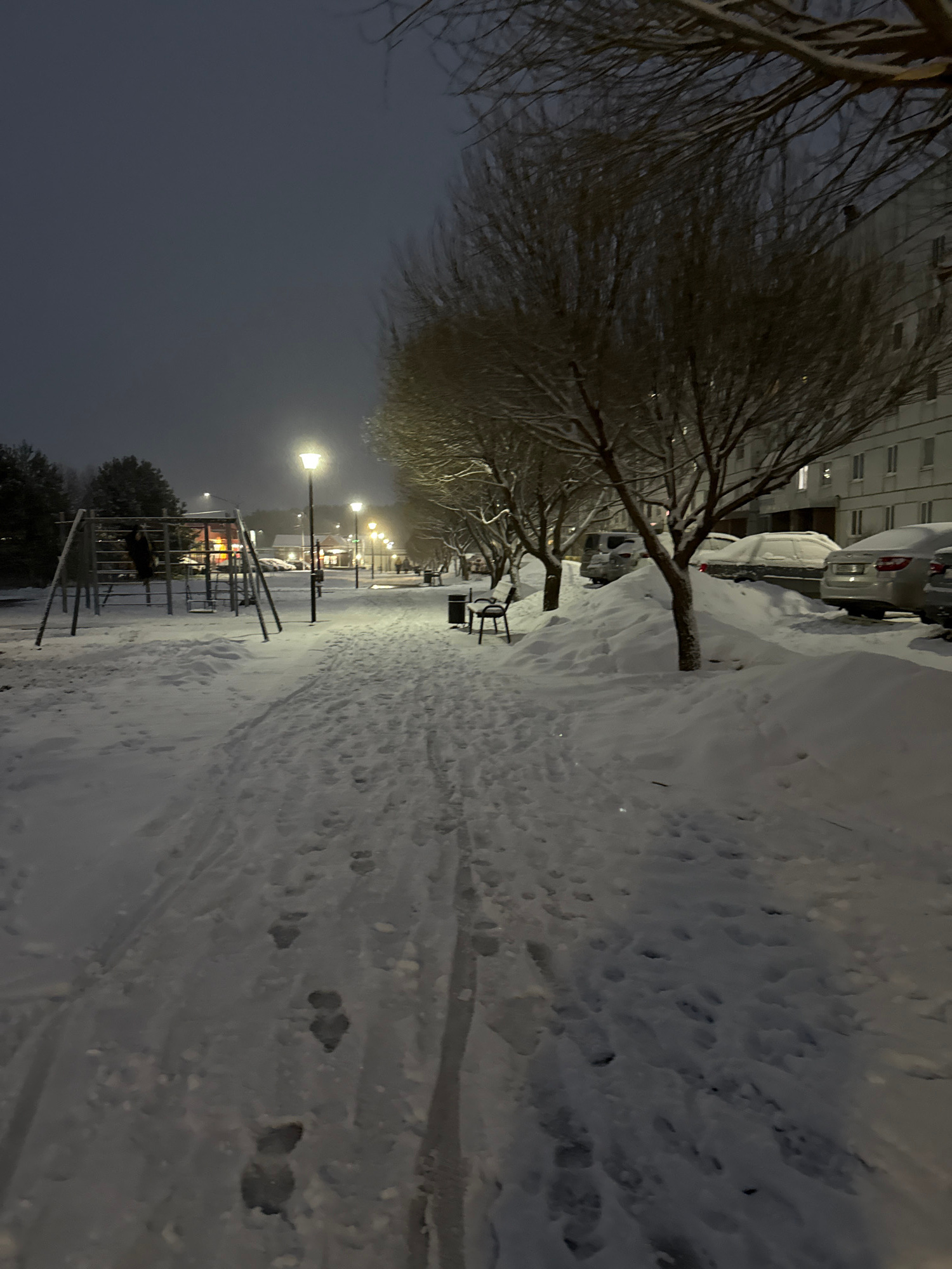 The image depicts a snow-covered scene in what appears to be a park or residential area in Chaikovsky, Russia. The location includes a pathway covered in snow with footprints. A row of leafless trees…read more