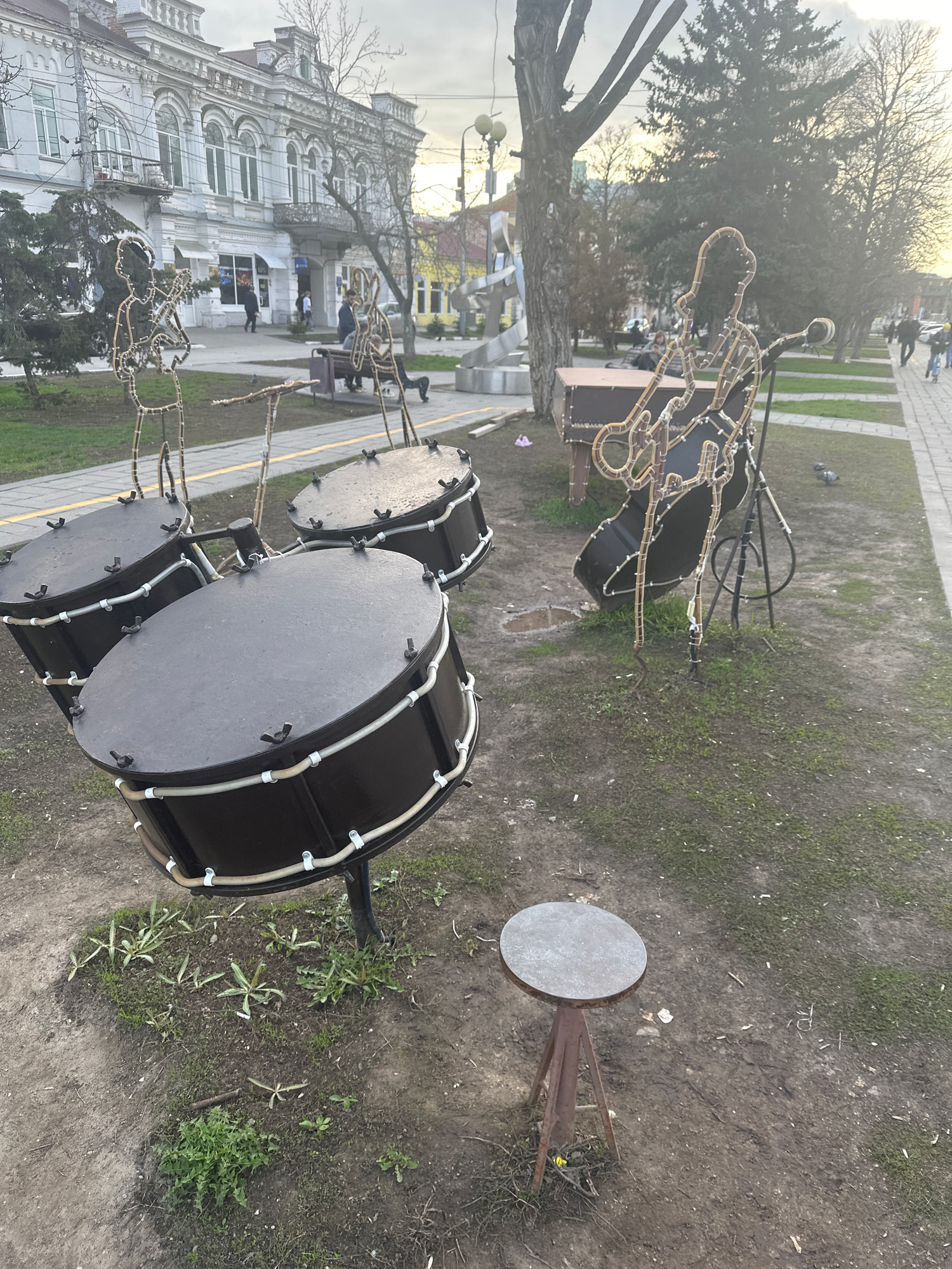 The image captures a musical sculpture in what is likely Engels, Russia, judging from the architecture. The sculpture consists of three large, black drums arranged vertically, diminishing in size from…read more