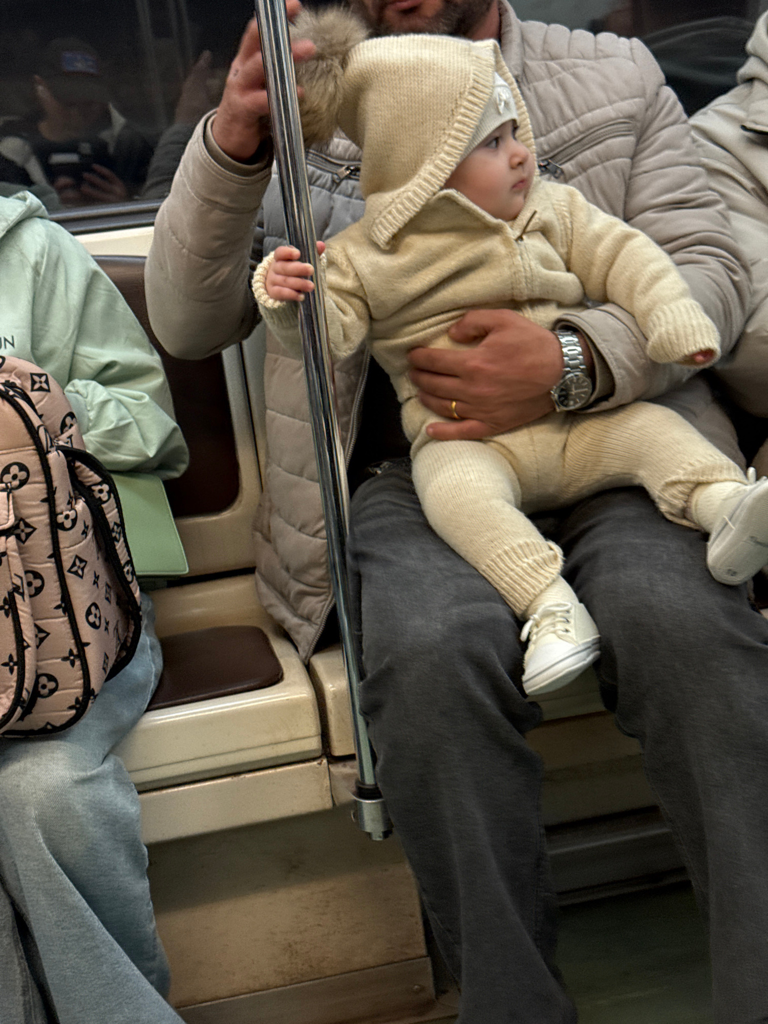 In Moscow, Russia, an infant lies on the lap of an adult wearing gray jeans. The child, clad in a knit hooded sweater and matching pants, holds onto a silver bar. A man's hand, adorned with a watch an…read more